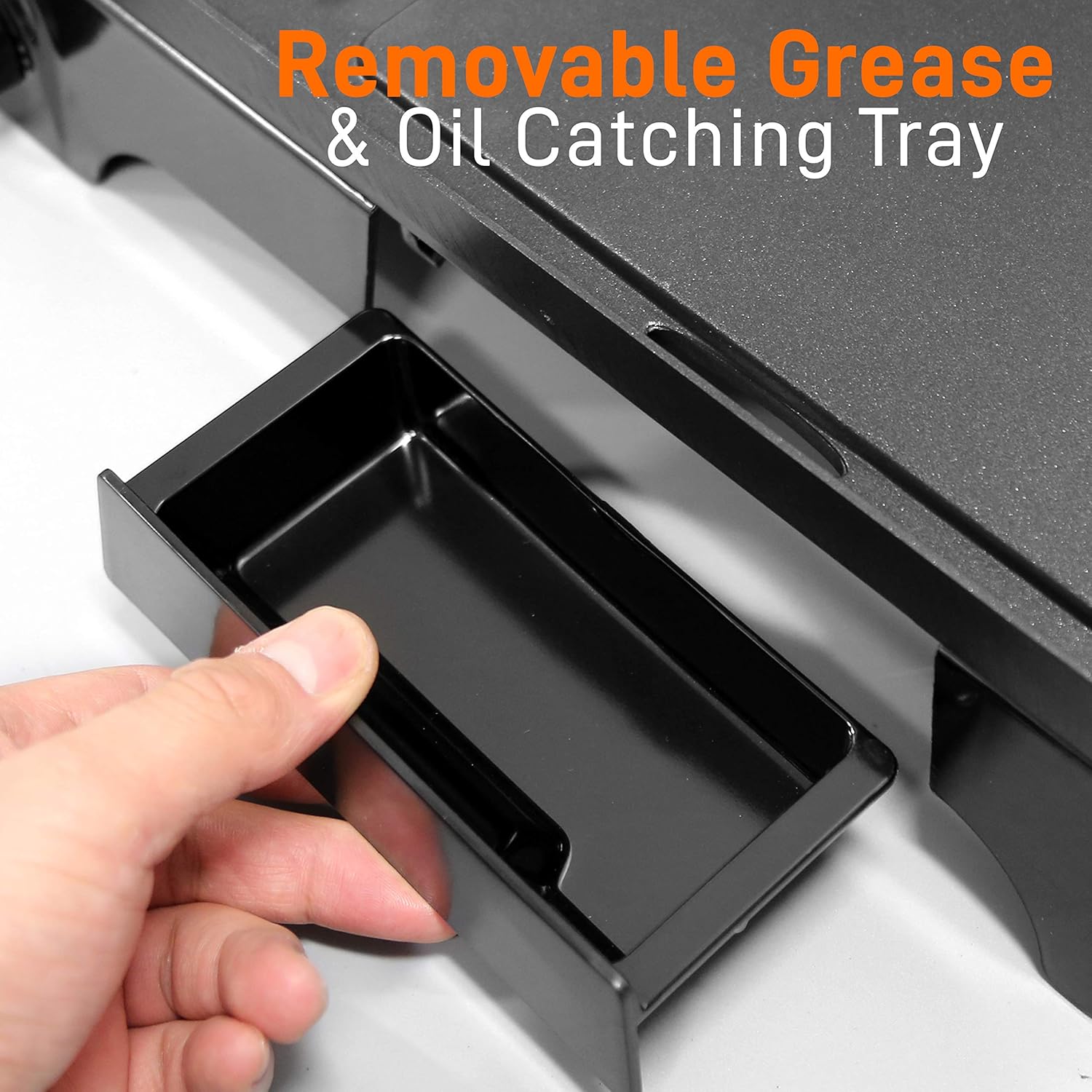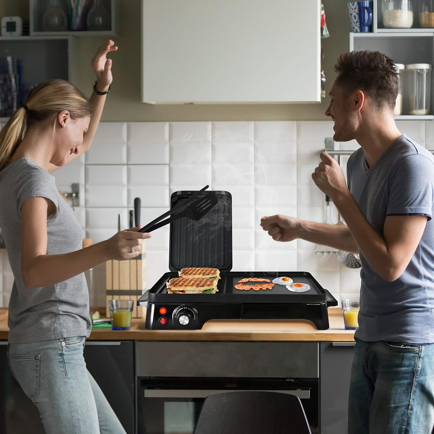 Discover a new way to create delicious, quick meals with the versatile Electric Griddle - Crepe Maker Hot Plate Cooktop with Press Grill. Designed for the modern kitchen, this 2-in-1 griddle and press grill is perfect for crafting the ultimate breakfast spread or tasty grilled paninis. Its non-stick coated plate and high-powered 1500-watt heating element ensure even cooking every time, whether you're frying up eggs, sizzling bacon, or pressing paninis to perfection. With compact construction, it fits easily on any countertop, making it a practical choice for all types of kitchens. Healthy cooking is made simple with its thoughtfully designed grease gutters, which channel excess oils into a removable drip tray. The cool-touch handle and rotary temperature control make handling safe and precise, ensuring every dish is made with care. This cooktop comes equipped with a griddle plate, oil-catching tray, and spatula tongs, providing everything you need to start cooking right out of the box. Built with die-cast aluminum for lasting durability, this griddle is stain-resistant and easy to clean, making it a convenient, all-in-one solution for everyday cooking.