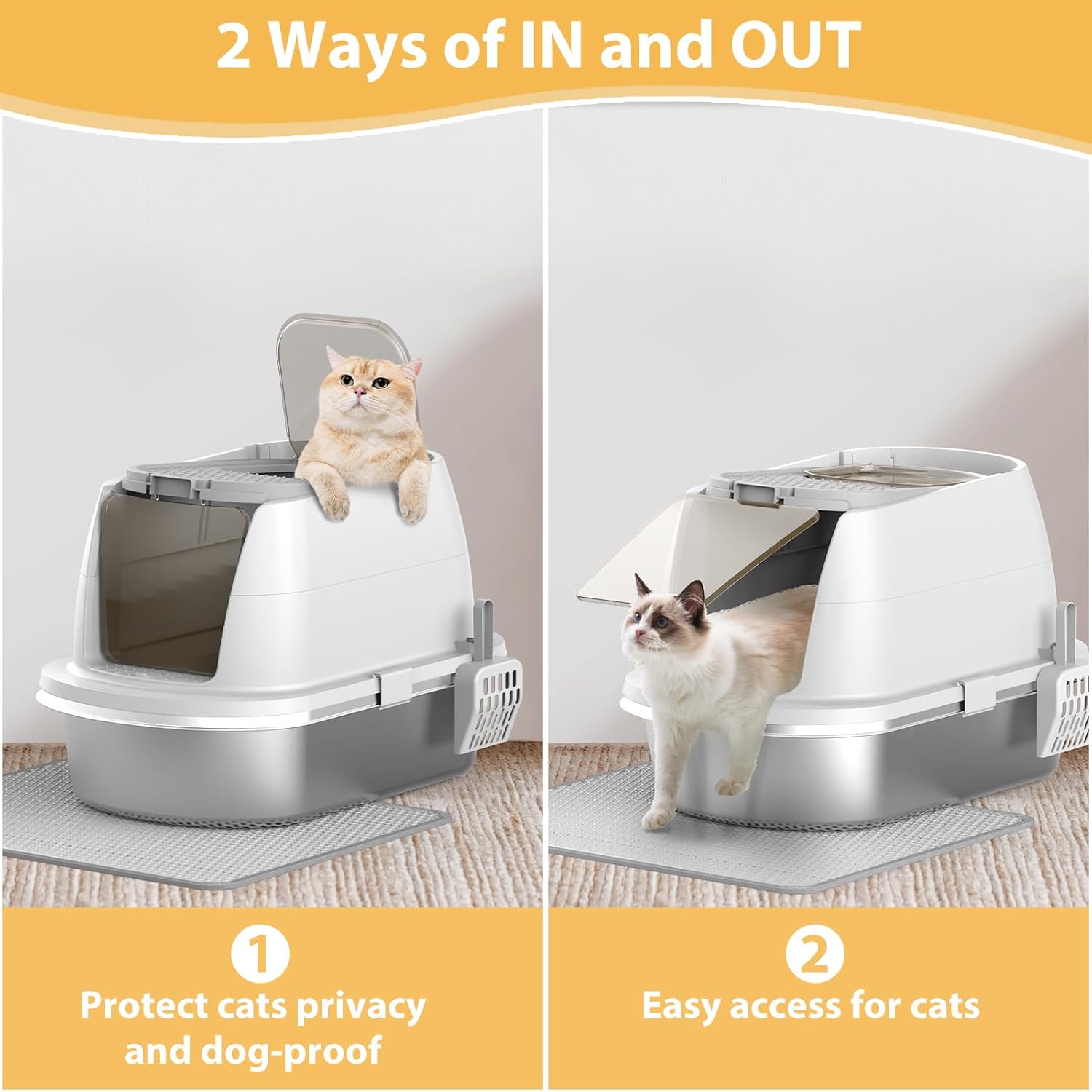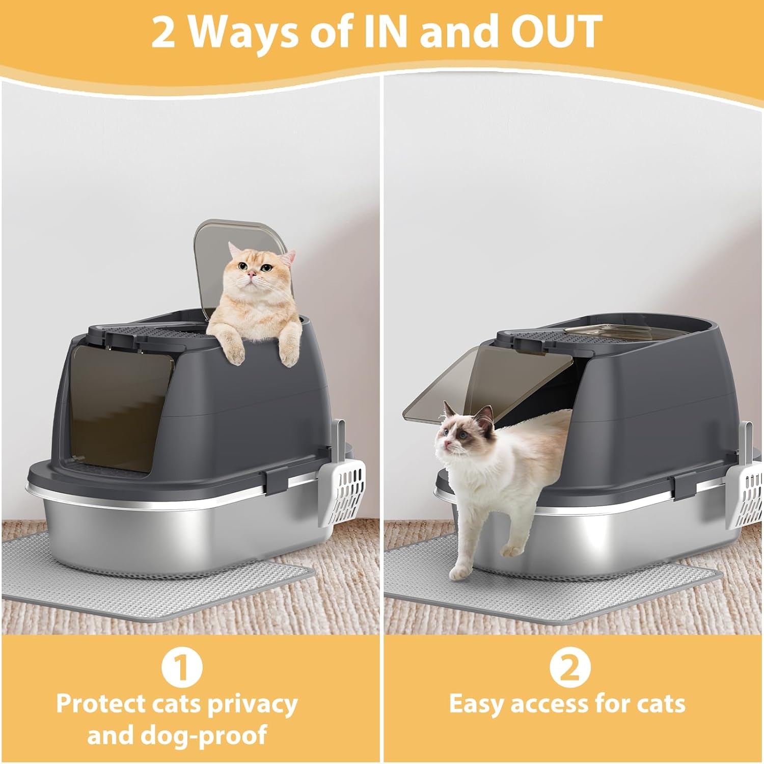 - Stainless Steel Litter Box: Our Cat litter box features a reinforced enclosure that securely clasps onto the high-sided stainless steel design, ensuring it won't be easily kicked off when your cats jump out, no sharp edges, no scratches, allowing you to focus on spending quality time with your beloved pets