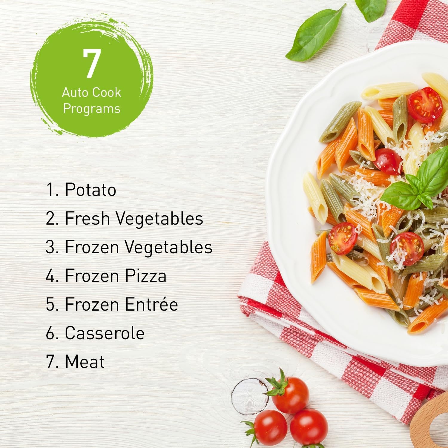 - 7 auto cook programs for a variety of one-touch meal options that take the guesswork out of cooking