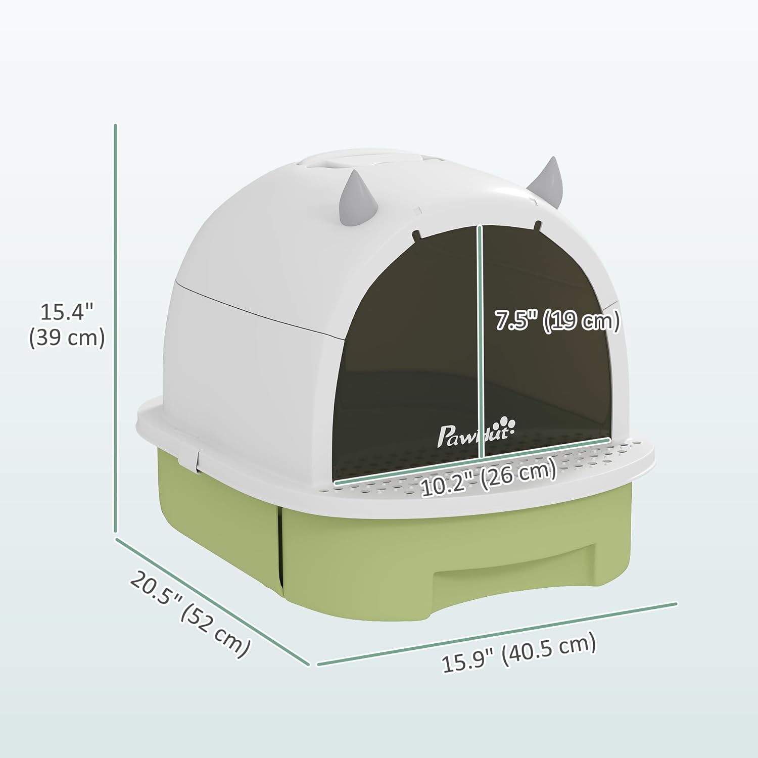 - Enclosed Cat Litter Box Information: Overall Dimensions: 15.9"L x 20.5"W x 15.4"H (40.5W x 52D x 39H cm). Internal dimensions: 13.4"L x 16.7"W x 14.6"H (34W x 42.5D x 37H cm). Suitable for cats under 10 lbs.(5kg). No assembly required.