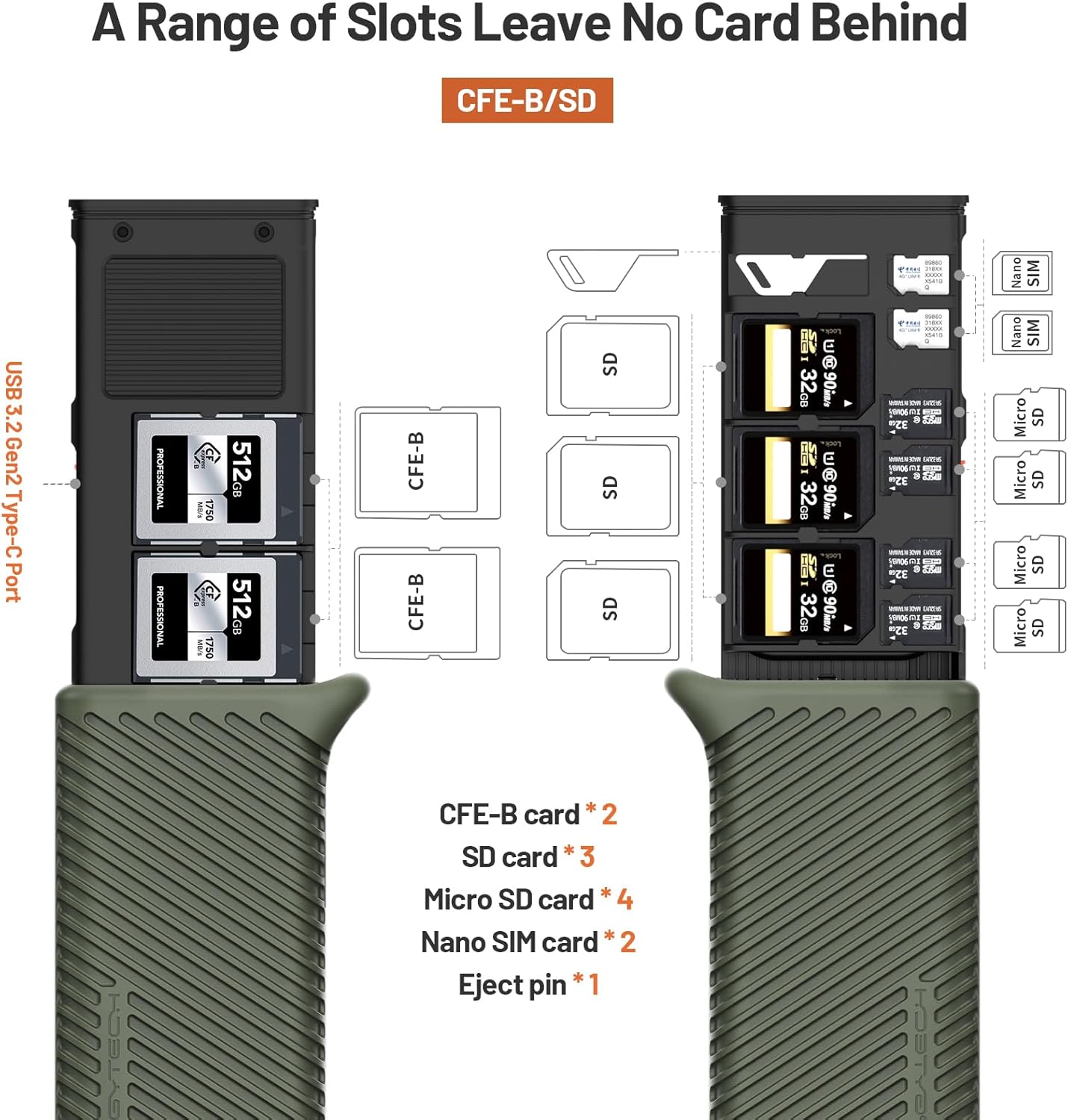 【Up To 10Gbps Transmission Speed】With a built-in USB3.2 Gen2 chip, it features a transmission speed up to 10Gbps; Compatible with CFexpress memory cards, boasting theoretical data transfer speeds of up to 1000MB/s; Compatible with SD 4.0 SD/Micro SD cards (via high-speed card adapter which included), boasting theoretical data transfer speeds of up to 312MB/s