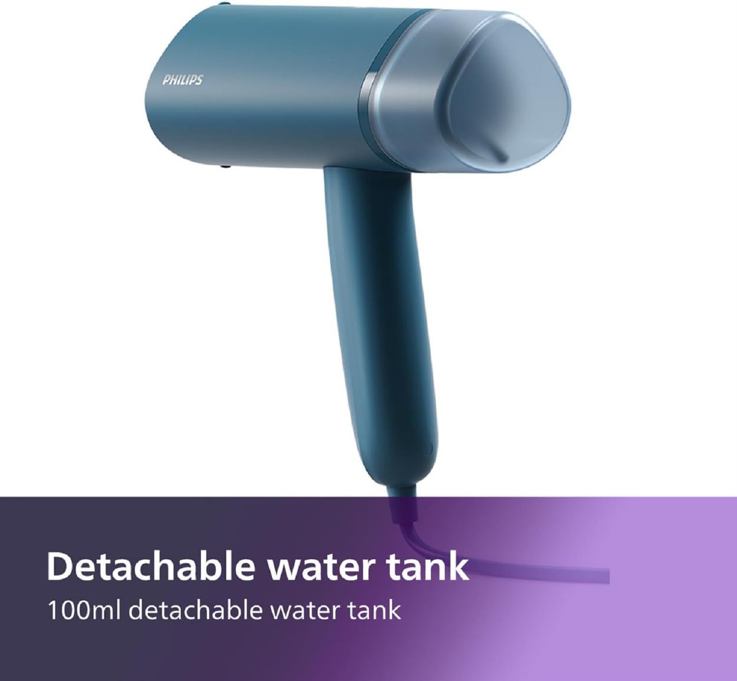 • 100ml detachable water tank: Handheld steamer 3000 Series comes with a 100ml detachable water tank to steam up to a full outfit without the need to refill