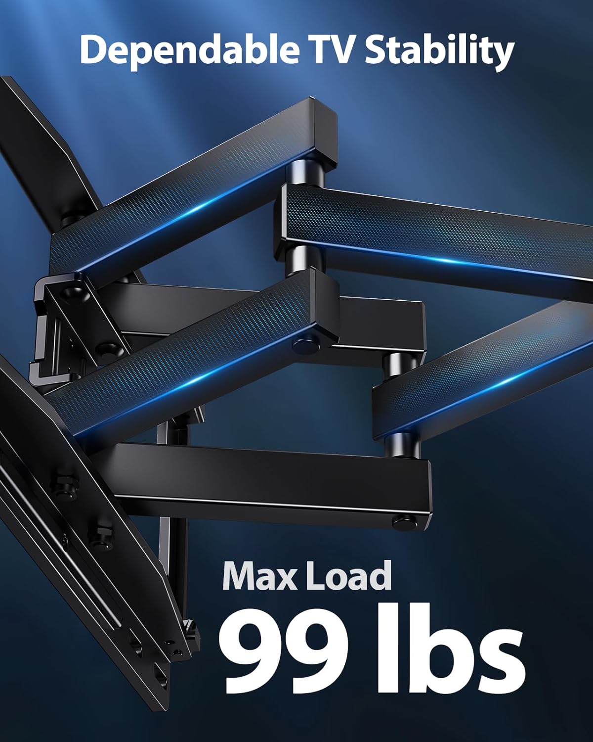 • Reliable TV Support: Featuring 30% thicker dual arms, heavy-duty steel wall plate, and screen security locks, you can trust this articulating TV mount to hold your TV securely in place. Rigorous TV bracket testing includes a 4x weight capacity test and 60,000 cycle tests to ensure long-lasting performance.