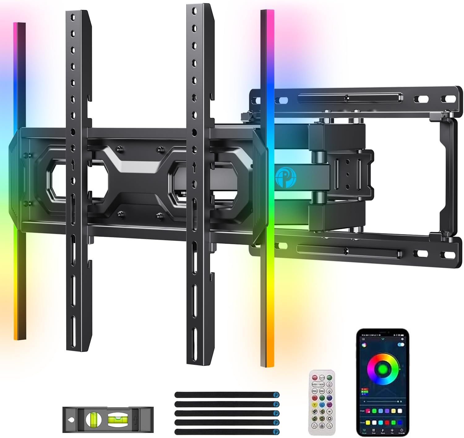 • Pipishell Pre-Assembled TV Wall Mount with LED Lights for 26-65 inch TVs up to 99 lbs, Max VESA 400x400mm, Swivel, Extension, Tilt, TV Backlights with Music Sync, Fits 16”/12” Wood Studs, PIMF20