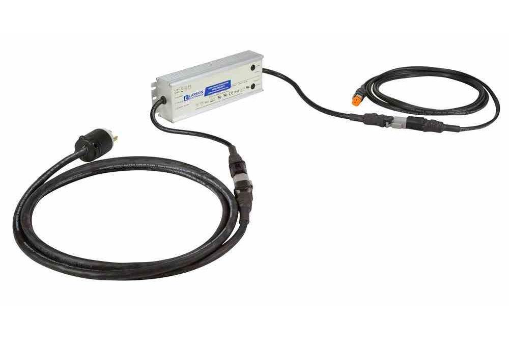 The Larson Electronics DSG-DCP-10-24V-10x10 Waterproof Power Supply converts commonly used 100-277VAC electrical current to 24VDC @10 Amps. This unit takes voltages within the 100-277VAC range and reduces it to 24VDC, allowing users to use standard AC power to operate equipment like our LED light bars and HID Golights that require 12 Volts DC. The DSG-DCP-10-24V-10x10 192 watt power converter provides a safe and effective way for users to tap into and utilize common 100 to 277 Volt AC power sources and convert this current to 24 Volts DC for use with equipment that requires 24 volt electrical power. This unit can be operated with input current ranging from 100 to 277 VAC and will output 192 watt 24 Volt DC current at 10 amps. This power converter features an IP67 rated waterproof design, making it suitable for indoor or outdoor use and is wet-damp area approved. This converter includes integral short circuit, over voltage, over temperature and overload protection that will shut down the unit or reduce output in case of faults and overloads to protect the unit and connected equipment from damage. The small size and wide input voltage range of this unit make it ideal for indoor-outdoor operation of Larson Electronics LED light bars, Golights and other equipment that requires 24VDC current and anywhere 24 volt DC power is not readily available. Measuring 9.6 inches long by 2.6 inches wide by 1.5 inches deep, this unit weighs approximately one pound and is mounted with two conventional screws via slots that allow removal and repositioning simply by loosening the screws. This converter offers several plug options for the 10’ input lead that include standard 5-15 straight blade plug for 110V wall outlets with ground, NEMA L5-15 twist lock plug for 125V twist lock outlets, NEMA L6-15 twist lock plug for 240V twist lock outlets, BS1363 3-blade plug for United Kingdom outlets, two pin Schuko plug for European outlets and a pigtail with flying leads. The different plug options make this unit “plug-n-play” compatible. THIS WILL NOT WORK WITH THE HID GOLIGHT SPOTLIGHTS (GL-3XXXH-X models). If you purchase this transformer with any of our Larson Electronics lights, we will make sure that the connectors are a match. Features: The DSG-DCP-10-24V-10x10 192 watt converter features full range, universal AC input capability and can be operated with 100 to 277VAC. The unit converts this AC power input to 192 watt, 10 Amp 24VDC output. IP67 rated, this unit is waterproof, wet and damp area approved and suitable for indoor or outdoor applications. Integrally designed protection includes overload, short circuit, over temperature and over voltage safeguards to prevent overheating and unit damage in case of faults or overly heavy current draw. This unit will limit current when an over current condition is encountered and recovers when the condition is removed. This unit will enter hiccup mode under short circuit conditions and recover when the fault is removed. The unit will also shut down when an over temperature condition occurs and recovers automatically when the temperature returns to normal levels. This power converter has a -30 / +60C operating temperature range and is UL UL1012 and UL60950-1 compliant as well as compliant with worldwide safety regulations for lighting. This unit has a 93% conversion efficiency and is suitable for use with moving LED signs and similar LED equipment. These units also feature Power Factor Correction, adjustable output current range from 5~ 10A either through the output cable or internal potential meter and have an input frequency range of 47 ~ 63Hz. NOTE: In order to obtain the best performance and the longest operational life from these units, it is recommended that you do not exceed 75% of the unit’s output amperage. To determine if this converter suits your desired application, add together the total wattage of the equipment you intend to use with this unit and divide this total by 12 volts to find the total amperage draw that will be placed upon the converter. For example, if you are using two of our LEDP10W-60E 60 watt LED lights, 120 watts divided by 24 volts is 5 amps. This would mean the DSG-DCP-10-24V-10x10 is well suited as it would run at 50% capacity to produce the necessary 5 amps. Running these units at 100% of their capacity can create excess heat and lead to shortened converter life.