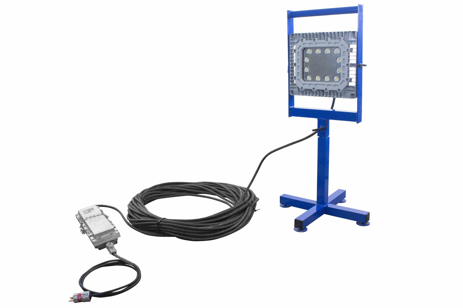 The LED light head produces a brilliant flood pattern of light that is ideal for illuminating enclosed areas and further adds to this units desirability as a portable tank lighting solution. This explosion proof LED light fixture is comprised of a 22 inch LED light head mounted atop a base stand fabricated from non sparking aluminum. Transferring the unit through manholes consists of simply removing the light head from the base, passing the light head and base through the manhole separately, and then reassembling the unit once inside. The lamp can be easily adjusted up or down 90 degrees and locked into position by simply loosening the two hand screws located on either side of the light head and re-tightening them once the desired angle is found. Included with this LED light is 200 feet of SOOW cord, which combined with the 360° of rotation and 90° of tilt offered by the LED light head provides an effective alternative to often cumbersome explosion proof string lights.