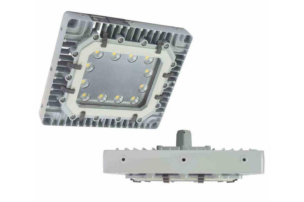 LED Benefits: Unlike gas burning and arc type lamps that have glass bulbs, LEDs have no filaments or fragile housings to break during operation and/or transportation. Instead of heating a small filament or using a combination of gases to produce light, light emitting diodes (LEDs) use semi-conductive materials that illuminate when electric current is applied, providing instant illumination with no warm up or cool down time before re-striking. Because there is no warm up period, this light can be cycled on and off with no reduction in lamp life. LED lights run at significantly cooler temperatures than traditional metal halide and high pressure sodium lights and contain no harmful gases, vapors, or mercury, making them both safer and more energy efficient. No extra energy is wasted in cooling enclosed work areas due to external heat emissions from bulb type lights, and the operator risks associated with traditional lighting methods, such as accidental burns and exposure to hazardous substances contained in the glass bulbs, are eliminated. In addition, LEDs are also safer for the environment as they are 100% recyclable, which eliminates the need for costly special disposal services required with traditional gas burning and arc type lamps. The explosion proof LED light fixture features multiple LED drivers which helps to increase the operational life of the fixture. With traditional LED lights, in the event an LED array or driver fails, the entire fixture no longer illuminates. This new series of LED lamps contains twelve individual LED boards configured in a series of banks. Each bank contains two LED boards with an individual driver. In the event of a driver failure, only one bank of LEDs will be effected while the other banks will continue to operate. In the event that of an LED failure, the mating LED will continue to operate. LED Drivers: Even in LED fixtures, heat is the single largest factor in premature light failure and color shifting. As a result, many manufacturers reduce the output of their LEDs in order to reduce the amount of heat produced. Rather than lower light output or quality, Larson Electronics addresses this problem with the addition of electronic LED drivers. These internal drivers provide the ability to automatically monitor and adjust input current to maintain the correct LED voltage levels regardless of input levels across a specific range. This not only reduces the energy dissipation, effectively lowering the operating temperature of the fixture, but also prevents AC over-voltage and short circuit loading making this fixture virtually maintenance free. Because the electronic drivers allow the EPL-HB-150LED-RT to run at a cooler internal temperature and regulates the electrical current, energy efficiency and LED service hours are maximized while at the same time reducing operating costs and downtime incurred from the frequent servicing intervals required with other hotter running lights. The explosion proof LED light fixture features multiple LED drivers which helps to increase the operational life of the fixture. With traditional LED lights, in the event an LED array or driver fails, the entire fixture no longer illuminates. With the EPL-HB-150LED-RT-NSF series of food safe explosion proof lamps from Larson Electronics, each LED fixture contains six individual LED boards configured in a series of banks. Each bank contains two LED on a single board with an individual driver. In the event of a driver failure, only one bank of LEDs will be effected while the other banks will continue to operate. In the event that of an LED failure, the mating LED will continue to operate.