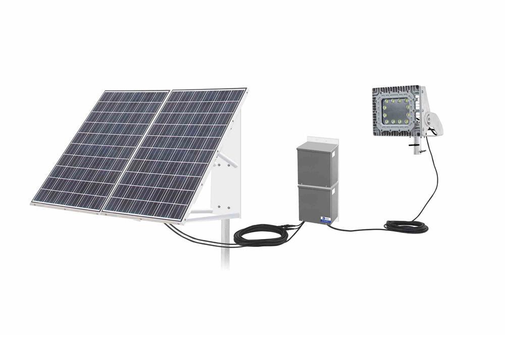 Made in Texas The EPL-PT-150LED-RT-LV-SOL-C1D1.C1D2 Explosion Proof Solar-powered LED Fixture from Larson Electronics is ideal for illuminating hazardous locations and remote industrial facilities. This lighting system consists of an explosion proof, 150-watt LED lamp, two 190-watt solar panels and an external Class I, Division 2 enclosure, which houses two, 250aH batteries and controls. A slip fit yoke mount allows operators to adjust the positioning of the light directly over the target area. The EPL-PT-150LED-RT-LV-SOL-C1D1.C1D2 is a sustainable lighting solution for illumination in hazardous locations. An explosion proof, 150-watt LED lamp provides 17,500 lumens of white light with a color temperature rating of 5,000K. Featuring a flood beam pattern, the low voltage unit can accommodate wide spaces. Powering the LED luminary are two 190-watt solar panels and two, 250aH batteries. The explosion proof light is constructed of cast aluminum with a hardened borosilicate glass lens. LED Benefits: Unlike gas burning and arc type lamps that have glass bulbs, LEDs have no filaments or fragile housings to break during operation and/or transportation. Instead of heating a small filament or using a combination of gases to produce light, light emitting diodes (LEDs) use semi-conductive materials that illuminate when electric current is applied, providing instant illumination with no warm up or cool down time before re-striking. Because there is no warm up period, this light can be cycled on and off with no reduction in lamp life. LED lights run at significantly cooler temperatures than traditional metal halide and high pressure sodium lights and contain no harmful gases, vapors, or mercury, making them both safer and more energy efficient. No extra energy is wasted in cooling enclosed work areas due to external heat emissions from bulb type lights, and the operator risks associated with traditional lighting methods, such as accidental burns and exposure to hazardous substances contained in the glass bulbs, are eliminated. Solid state LED lighting is also safer for the environment as LEDs are 100% recyclable. And recycling simultaneously reduces operating costs by eliminating the need for the expensive special disposal services required with traditional gas burning and arc type lamps. Battery/Solar Panels: Charged by two 190-watt rated solar panels, two 12V 250aH 8D batteries provide constant, reliable power to the LED fixture. As with all solar powered equipment, charging time is affected by the amount of available ambient light. Indirect sunlight and low ambient light levels, such as on cloudy days, will extend the charge time. The valve regulated lead acid batteries and controls are contained within a heavy-duty remote enclosure that is powder coated aluminum for corrosion resistance and includes pad-lockable hasps. The Class I, Division 2 enclosure is equipped with circuit breakers for short circuit protection. Mounting: The explosion proof light features an adjustable swivel bracket constructed of 3/8" aluminum that allows over 270° of adjustment and is attached to a slip fit yoke mount for easy installation. The slip fit yoke caters to customer`s specs, enabling operators to mount this explosion proof LED light to their specific pole size. For example, selecting a 2" OD mount means that the yoke mount will fit onto pipes or bull horns with a 2" OD. During installation, operators may mount the solar panels away from the LED lamp on a pole, allowing optimized positioning for direct exposure to sunlight (not in the hazardous area). Standard installation for explosion proof lighting, including threaded rigid pipe to the LED light fixture and appropriate seal-offs, etc. are required. Wiring: The EPL-PT-150LED-RT-LV-SOL-C1D1.C1D2 ships with 40 feet of 12/2 SOOW cord, consisting of 20` 12/2 SOOW cord between the solar panels and battery enclosure, and 20` 12/2 SOOW cord between the battery enclosure and the explosion proof LED lamp. Custom lengths are available upon request. Please contact us for special requirements. Applications: Paint spray booths, aircraft maintenance, oil drilling rigs, refineries, solvent and cleaning areas, gas processing plants, chemical manufacturing, waste treatment plants, agricultural sites, grain storage facilities and more.