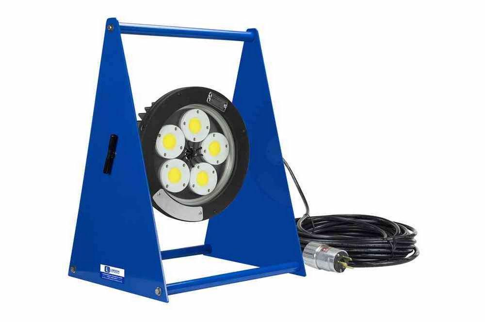 Mounting: This portable LED light is mounted on an A-frame style aluminum base. The portable base stand is fabricated from non-sparking aluminum with a convenient carrying handle built into the top of the stand. The aluminum A-frame is powder coated with glossy blue finish for corrosion resistances and aesthetics. The lamp can be easily adjusted up or down 90 degrees and locked into position by simply loosening the two hand screws located on either side of the light head and retightening them once the desired angle is found.