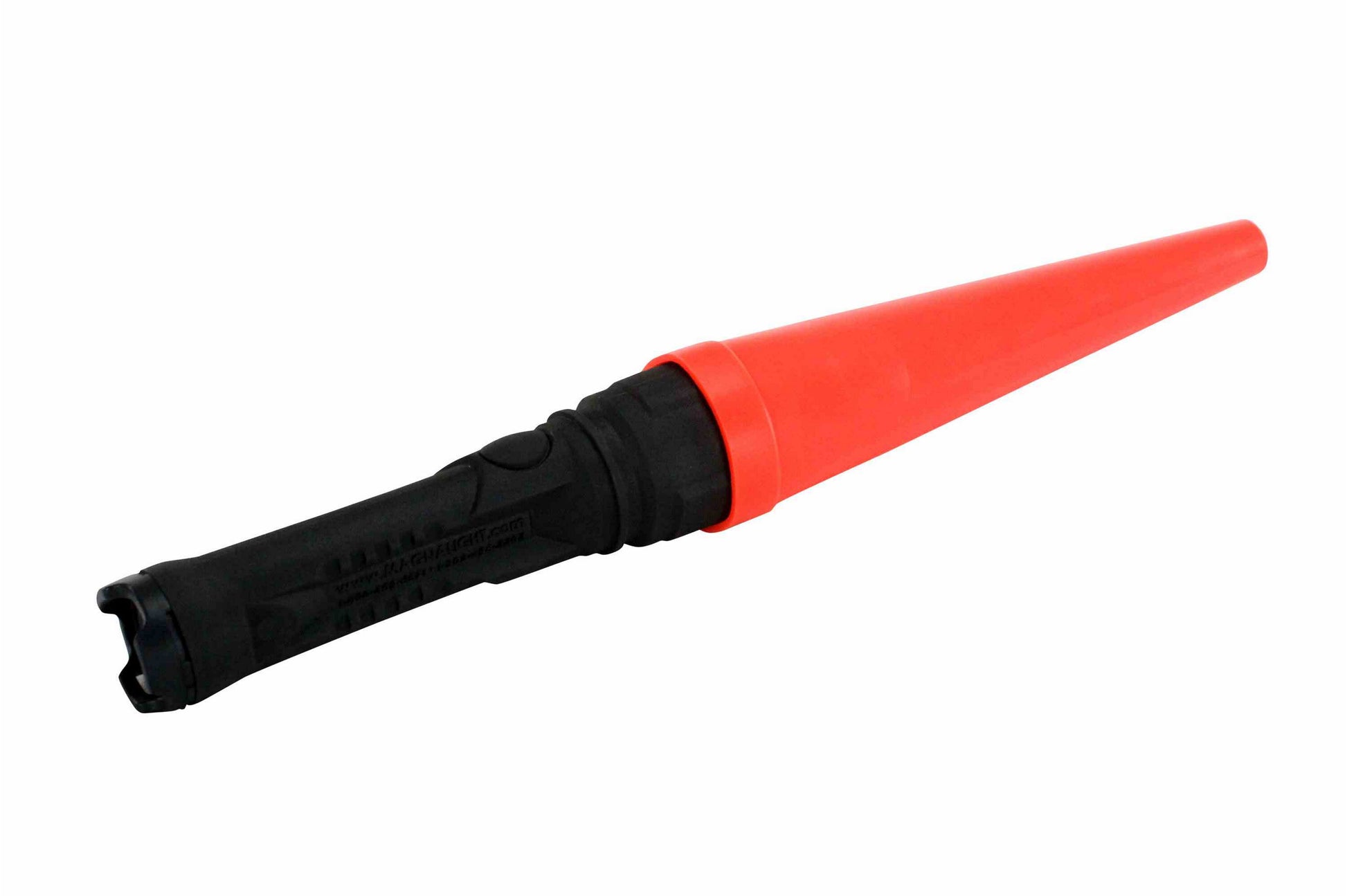 This LED traffic control wand features a deep dish reflector that focuses the light from the high output LED into a tight round beam to fully illuminate the red traffic cone attachment. An ergonomic tactical design adds great versatility and durability, allowing this light to be used in industrial or professional applications with equal effectiveness. A rubber push button switch provides easy operation while a knurled body design allows for maximum grip and control. The traffic cone snaps on, allowing operators to turn this explosion proof traffic wand into a high output explosion proof flashlight without any special tools.