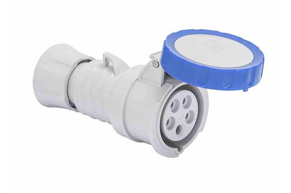 The Larson Electronics GAU-120.208V-4P5W-32A-C-IP67 Weatherproof Pin and Sleeve Connector is a 32 amp and 120/208 Volts AC rated connector approved for industrial use. This 4-pole 5-wire portable receptacle is designed to provide a secure connection for electrical equipment within the general industrial environment. This pin and sleeve connector features a hinged cover and has a maximum operating voltage of 120/208V AC. This water tight pin and sleeve connector is IP67 rated. This water tight 3P+N+E pin and sleeve portable receptacle is rated for 32 amps and 120/208V AC. The GAU-120.208V-4P5W-32A-C-IP67 industrial connector features toughened PVC construction, a hinged cover, a 32 amp current rating. The GAU-120.208V-4P5W-32A-C-IP67 is IEC 60309 rated for cross compatibility . Suggested Applications: Manufacturing, industrial, warehouse, lighting, motor-generator sets, compressors or wet areas.