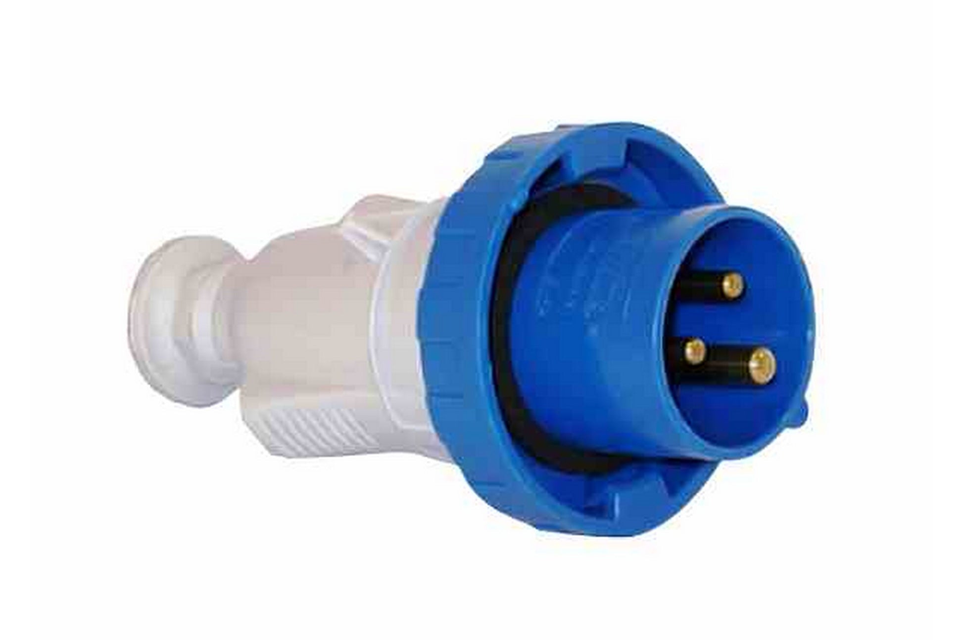 This weatherproof 2-pole 3-wire pin and sleeve plug is rated for 16 amps and 220-240V AC. This weatherproof industrial plug features toughened nylon construction, recessed brass pins, and a 16 amp maximum current rating. The GAU-240V-2P3W-16A-P-IP67is IEC 60309 rated.