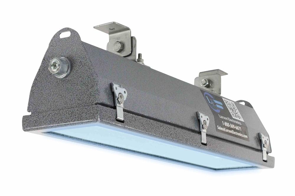 Made in the USA The HAL-24-3L-BMSW-BL-UVC from Larson Electronics is an Explosion Proof UV Fluorescent Fixture that provides ultraviolet illumination in Class I, Division 2 locations and is designed for germicide applications. This unit features three, 2` T8 UV fluorescent lamps, housed in a copper-free aluminum housing and protected by a glass lens. The luminary caters to surface mounting and operates on 120-277V AC. *Please note: This product produces UV light. Make sure to follow all safety guidelines and protocols found in the user manual. UVC light in the proper setting kills up to 99.9% of viruses, mold, spores and bacteria. * The HAL-24-3L-BMSW-BL-UVC is a fluorescent-based UV lighting system that offers germicide lighting for Class I, Division 2 facilities. Consisting of three, 2` T8 fluorescent lamps, the luminary provides a wide beam angle of 150 degrees during operation. The outdoor, marine-type fixture boasts an expected lifespan of 9,000 hours and an operating temperature range of -30°C to 85°C. The explosion proof UV lamp, which operates on 120-277V AC, is constructed of copper-free aluminum alloy and powder coated. The lamp reflector is corrosion resistant heavy gauge aluminum and coated with a high gloss reflective finish. A glass lens protects the unit and provides robust transmission of UV light during operation. Designed for Class I, Division 2 work sites, the fluorescent fixture is offered in the UVC (280nm - 100nm) "germicidal" wavelength range. Standard Surface Mount Brackets: Each L bracket is cinched to the bracket mounting peg on each side of the light. The angle of the bracket is set by tightening two bolts on either side of the bracket. The bolts act as a set screw. The bracket itself is mounted via a single bolt hole at the top the bracket. There are two brackets. Once the brackets are mounted to a surface (ceiling, floor or wall), the light fixture can be pivoted by loosening the that hold the bracket to the mounting peg. This fixture allows 45 degrees of pivot from the 90 degree point. Wiring: Power connections to the explosion proof UV unit can be completed via an accessible, threaded wiring hub (1/2" or 3/4"). Note on Environment: Sunlight and visible light fixtures do not impact the effectiveness of the disinfecting on this UVC sanitation product. Metal halide, high pressure sodium, fluorescent, and LED light fixtures can be left on. The UV radiation emitted from this product is not disrupted by any type of lighting in the environment. Put simply, NO it DOES NOT need to be dark in the area you plan to disinfect. The UV radiation is harmful to the eyes and skin, and that is why you should not be in the area while it is in operation. Please see user manual for additional safety information. Suggested Applications: Aircraft maintenance, oil drilling rigs, refineries, solvent and cleaning areas, chemical manufacturing, waste treatment plants, gas processing plants, hazardous locations, inspections, paint spray booths, NDT, curing, laboratory analysis, chemistry and more. |