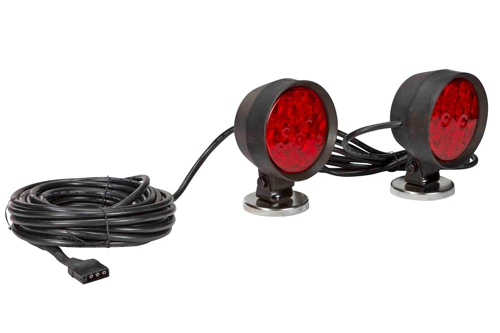 The Larson Electronics HDTL-LED-2X-M-30-WP is a weatherproof wired magnetic tow light consisting of (2) round 2lb tow lights, (2) 90# temporary magnetic mounts, a 30ft standard cable ending in a customizable trailer plug, and 7' of wire space between the two tow lights. The durable LED lights on this unit are stop, trail and turn capable and emit a very visible red light that is very clearly signaled to other drivers, helping prevent rear end accidents and other potential road oversights.