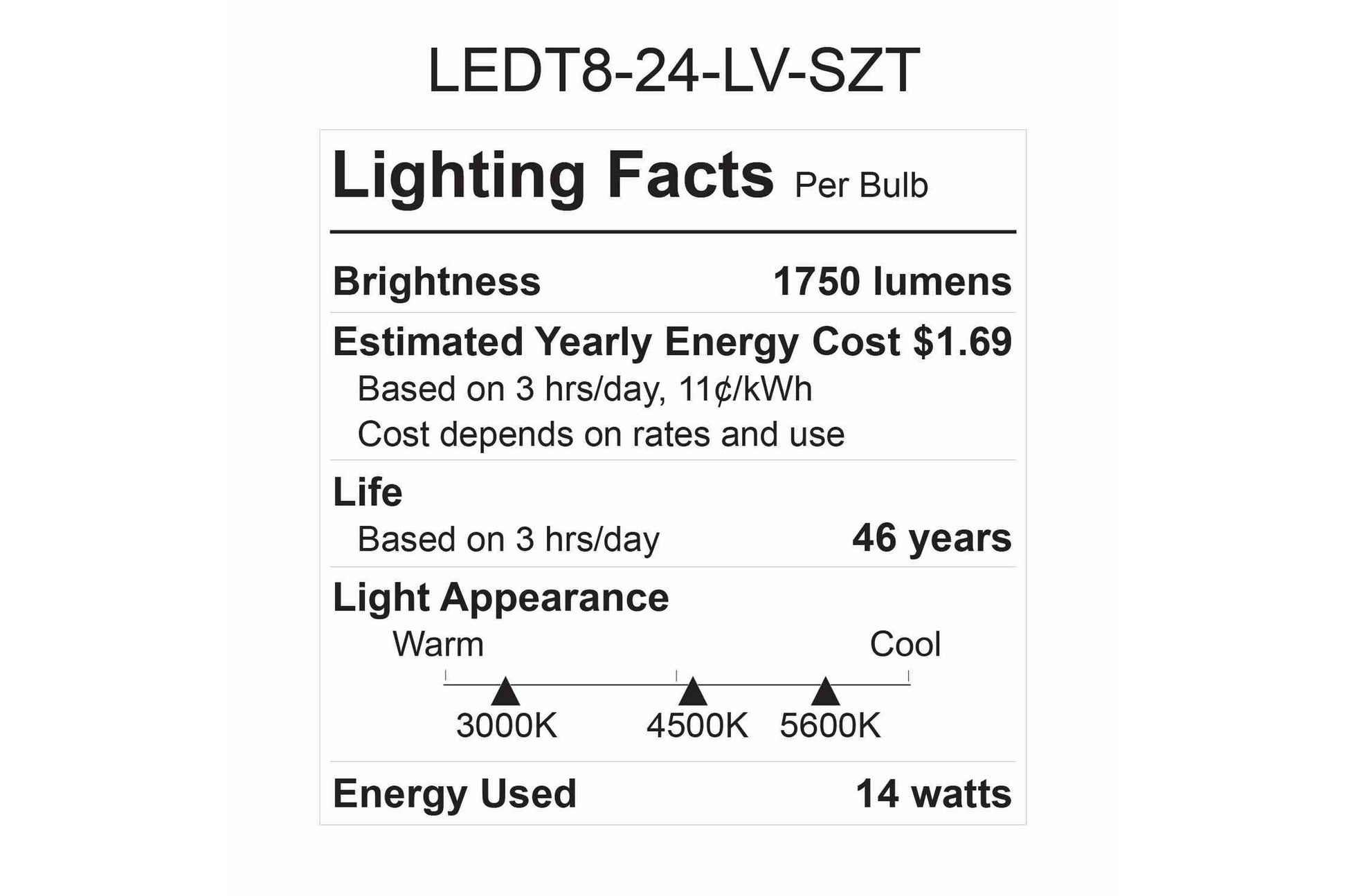The LEDT8-24-LV-SZT features specially designed rotating end caps. Fluorescent lamps provide a full 360° beam coverage around the lamp. Since most fluorescent fixtures require directional lighting, reflectors have to be used to bounce the light back towards the intended target area for illumination. LED lamps are directional, which eliminates the need for back mounted reflectors and reduces wasted and lost light. However, the tombstones for existing fixtures may position the face of the LED lamp in a direction facing away from the target illumination area. With the rotating pins, operators can reposition the lamp so the face of the LED tube is positioned properly within existing fixtures. This also allows for fine tune adjustment of each individual lamp within fixtures containing multiple lamps.