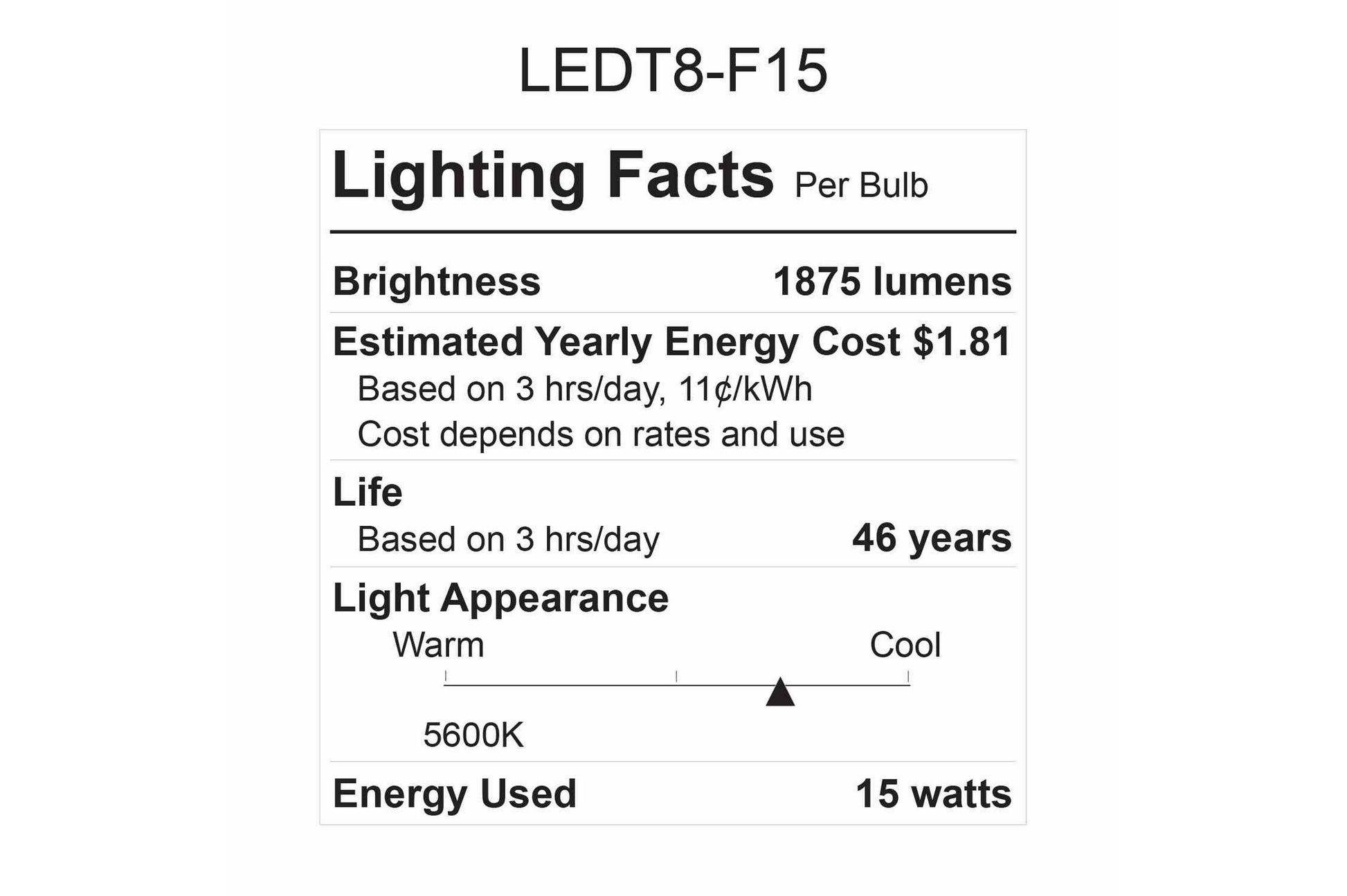 These are the second generation of our 15 watt LED tubes. Using an Extech light meter, these LED T-series lamps produced 15% more foot candles of the same fixture with two F15 T8 bulbs when measured at a distance of 8 feet. Lumen output is 125 lumens per watt for a total of 1,875 lumens per bulb.