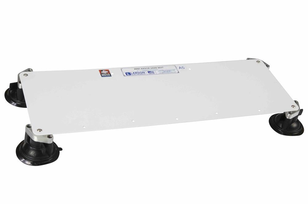 | Made in Texas The MMP-4XSCM-24X8-V2 from Larson Electronics is a Suction Cup Steel Magnetic Mounting Plate for any light with a magnetic mounting base, including spotlights, flood lights, strobe lights, beacons, warning lights, signal lights, flashers, turn signals, brake lights, hunting lights, fishing lights, off-roading lights and so on. This lightweight mounting plate mounts quickly and easily to non-magnetic surfaces such as glass, aluminum or polycarbonate and can support lights of up to 20 lbs. The MMP-4XSCM-24X8-V2 features a 24" by 8" magnetic mounting surface with 3 inches of clearance, four 3.3" diameter twist lock suction cups, can be mounted securely on any flat, non-magnetic surface and offers operators a convenient mounting location for any magnetic light and for applications including hunting, fishing, off-roading and security. The MMP-4XSCM-24X8-V2 is constructed in Texas from high strength composite and powder coated marine grade aluminum for the suction cups and powder coated steel for the mounting plate surface. This magnetic mounting plate has been designed to work on any flat, non-ferrous surface such as glass, polycarbonate or fiberglass and offers operators a sturdy and reliable platform to deploy magnetic mount lights of any type such as spotlights, strobes, beacons, hunting spotlights, signal lights, security lights and warning lights, on the top of their truck for optimal performance. The MMP-4XSCM-24X8-V2 is installed quickly and easily on appropriate surfaces by using the twist lock function to lock each suction cup in place in the desired location. The mounting plate requires absolutely no drilling for installation and is powder coated for added durability, can support up to 20 lbs and is offered in a black, white, or grey finish. The MMP-4XSCM-24X8-V2 also features a windload okay for highway speeds. (User provided equipment may vary). Underneath the mounting plate is a 3 inch clearance, which allows the plate to be mounted above other equipment such as running lights. Installation: The MMP-4XSCM-24X8-V2 is easy to install and requires absolutely NO drilling. This suction cup magnetic mounting plate installs on any flat, non-ferrous surfaces (including glass, polycarbonate and fiberglass) via the four 3.3" diameter twist lock suction cups. Operators simply place the unit where they want it mounted and use the twist lock levers on each suction cup to securely lock it in place. Applications: Hunting, fishing, off-roading, property management, security, search and rescue, farming operations and any other applications for which a mounted spotlight is needed on a flat, non-magnetic surface such as glass, polycarbonate or fiberglass.  |