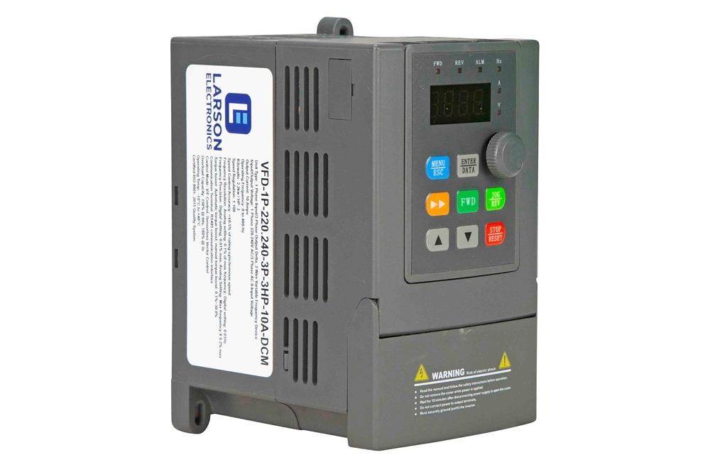 The VFD-1P-220.240-3P-0.5HP-3A-DCM from Larson Electronics is a Single-Phase Input, 3 Phase Output, 3-Wire Configuration Variable Frequency Drive Phase Converter that is suitable for improving AC motor performance in industrial operations. This fan-cooled unit features a 220-240V AC input/output voltage comparability. Designed for steady speed error, fast torque rise and protection from resonance vibrations, the device provides an output current of 3 amps and an operating frequency range of 0 to 400 Hz with 1/2 horsepower. The VFD-1P-220.240-3P-0.5HP-3A-DCM offers accurate AC motor control in industrial facilities. This 0.4kw unit is compatible with single-phase input and three-phase output 220-240V AC voltage, provides an output current of 3 amps and an operating frequency range of 0 to 400 Hz. This device has a V/F control mode and sensorless vector control mode with an interior PID controlled, automatic energy save running to optimize the V/F curve, an automatic voltage regulator and automatic current limiting. The VFD-1P-220.240-3P-0.5HP-3A-DCM is designed for indoor applications and operating temperatures ranging between –10°C to +40°C. Operators may mount the VFD phase converter on compatible surfaces. This device measures 5.59" x 3.34" x 4.44" and weighs approximately 4.4 lbs. Applications: Speed control of AC motors, industrial machines, large compressors, energy savings and more.