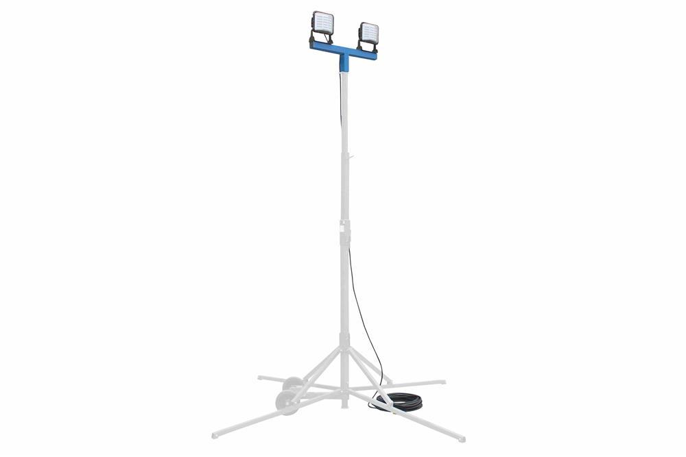 This portable LED light is comprised of two adjustable LED light heads mounted atop a four leg quadpod fabricated from heavy duty steel (mount sold separately). This adjustable and collapsible quadpod pod can be extended to twelve feet and collapsed to seven feet, and includes solid wheels to allow the operator to tilt the unit back and simply roll the entire assembly to a new location when fully deployed. The LED light fixtures can be rotated 360° by loosening the trunnion mount, rotating the light to the desired position, and righting the bold. A 180° tilt is available to each lamp by adjusting the set screws located on either side of the lamp and then retightening them to lock the angle in place. The entire assembly can be removed by releasing the hand knob and sliding the light and mounting bracket off of the center support while the legs can be collapsed, aiding in deployment, storage and transport. The lamp can be easily adjusted vertically and locked into position.