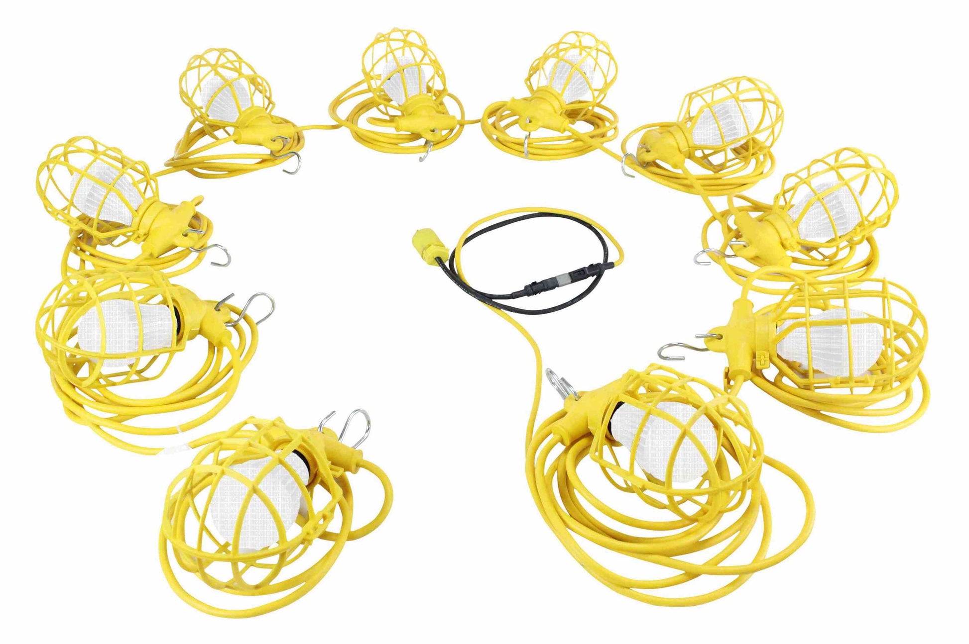 Each light has a yellow plastic mesh guard enclosure that provides protection for the enclosed bulb and a hook that allows operators to hang these tasks lights overhead. Multiple light stringers can be connected end to end to extend work area illumination.