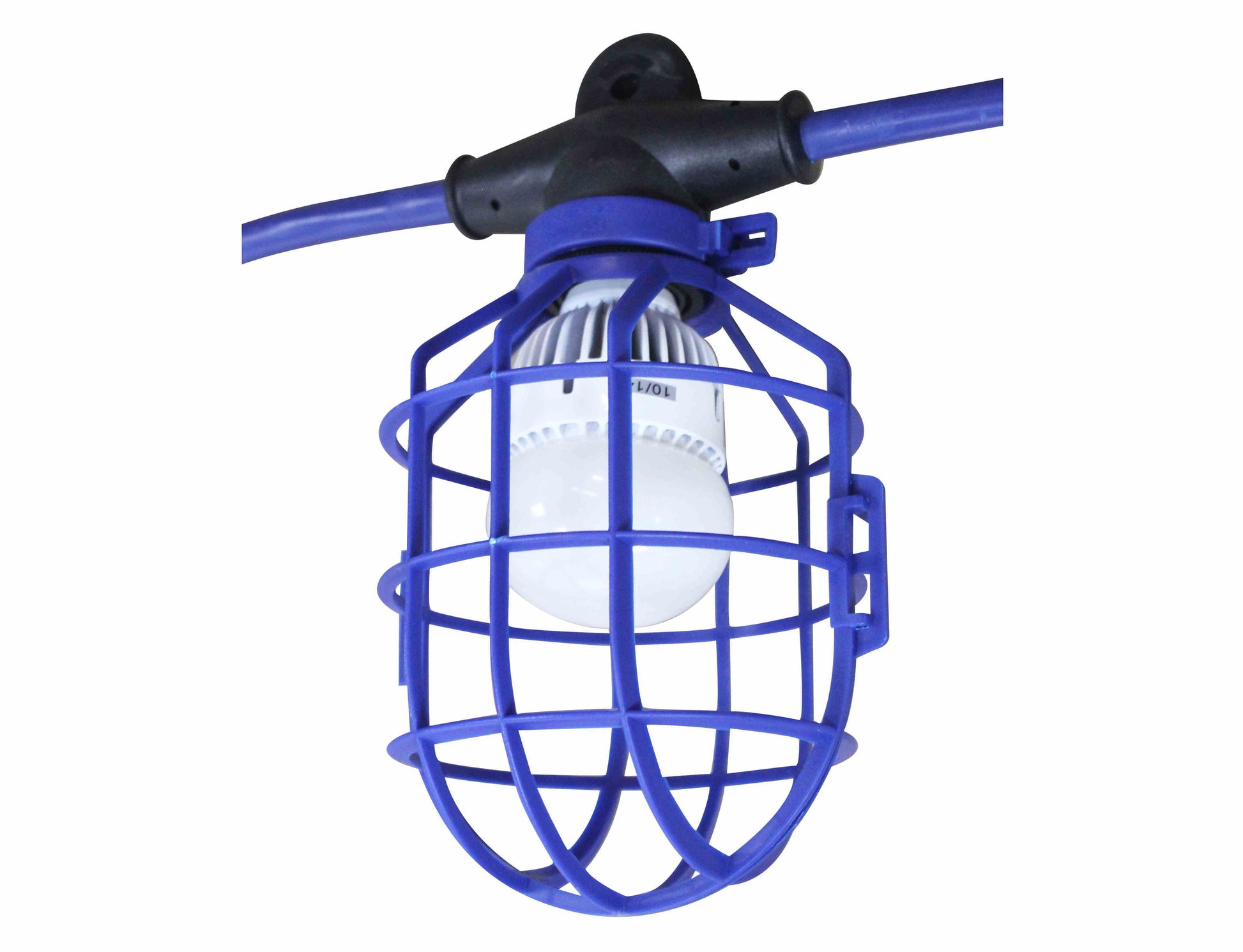 This work area string light consists of ten industrial grade LED lamps with 10 feet of 14/2 SJTW cable between each unit. This temporary LED string light is connected to power via an integrated 3 foot cable terminated with a standard 5-15 straight blade plug. Each globe light is equipped with a high output LED bulb which delivers more light output than a 100 watt incandescent. The 10 watt LED bulb draws 10% the electrical power of a standard 100 watt bulb, making it suitable for standard voltage and low voltage applications. Each LED light screws into a molded E26 lamp socket and the bulb is enclosed in a bird cage style plastic guard.