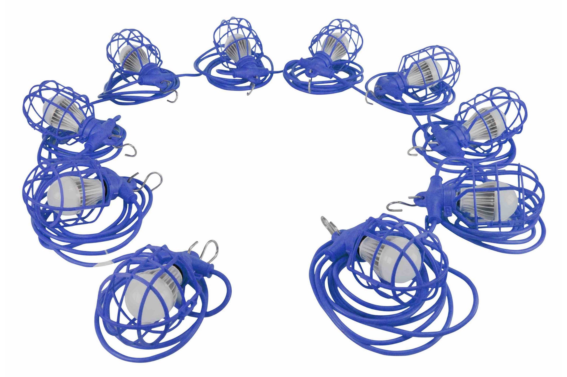 Each light includes a blue plastic mesh guard enclosure that provides protection for the enclosed bulb and a hook eyelet with a S-hook that allows operators to hang these tasks lights overhead. Utilizing energy efficient LED lamps, operators are able to provide more light coverage from the same amp draw, or lower the amp draw using the same amount LED lamps as incandescent. Each LED trouble light has an effective range that approximately covers a 5-8` radius with 10-15 foot candles of light. Unlike fragile incandescent and compact fluorescent lamps that are made from glass, these LED bulbs are extremely durable and can live up to the abuse of harsh working conditions. With a lamp life of 50,000 hours, operators are not constantly having to replace burnt out or broken lamps, reducing down time and lowering the amount of spare lamps required at the job site.