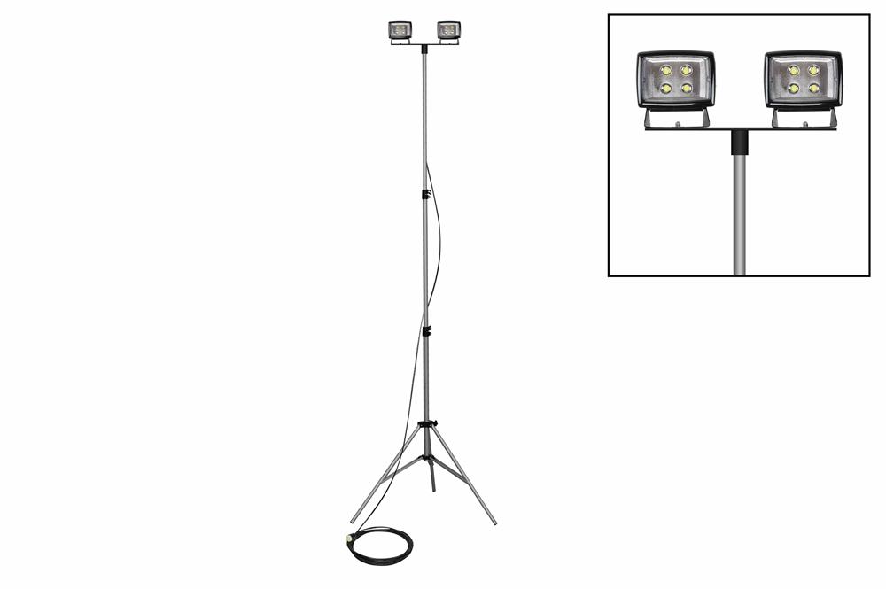 The WALTP-2XWP500-25C consists of two, LED light heads mounted atop a telescoping tripod tower. Designed to operate on 110-277V AC, each LED light head consists of four high output LEDs housed within a waterproof aluminum housing that is powder coated for added durability and resistance to corrosion. The housing incorporates integral cooling fins for efficient heat dissipation and increased LED longevity. The LED lamp assembly is protected by a shatterproof polycarbonate lens which is secured to the housing with a waterproof seal. A 1/2" waterproof connector provides a secure and sealed power connection point and rounds out this unit`s weather resistant construction.Â