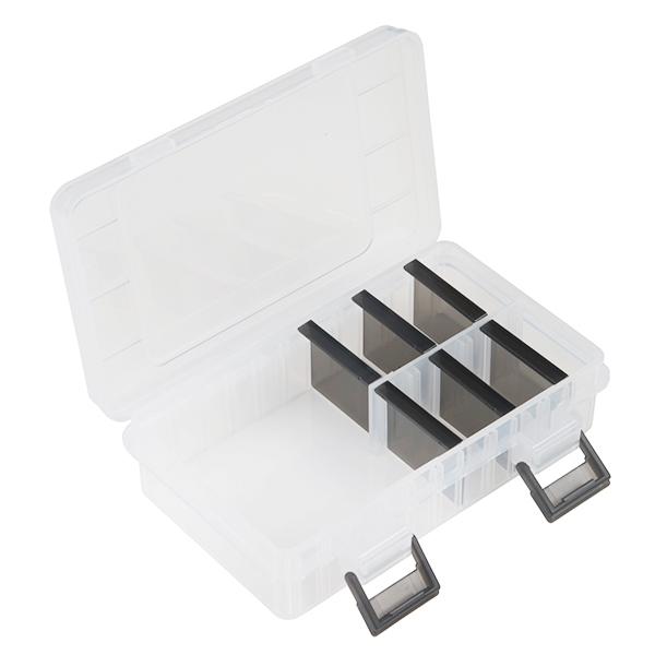 This is a small, adjustable part box for components, breakouts and development boards. Made from a clear polypropylene with reliable locking tabs, this box is incredibly durable and water-resistant. The best part about this little box is the six included dividers that can modify the inside of the container, providing you with compartments as small as 10mm x 40mm.