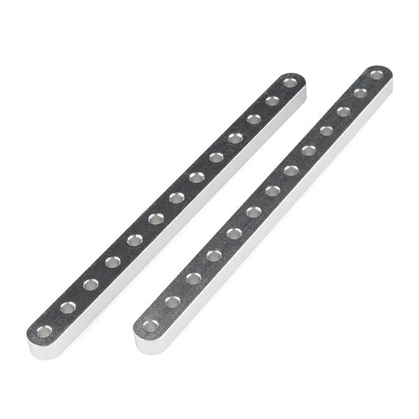 These aluminum beams are great for making unique links and connections in your [Actobotics](https://www.sparkfun.com/pages/Actobotics) project thanks to 13 through-holes running its length and are sold in packs of two. Each beam has a length of 4.62", a width of 0.375", a thickness of 0.25", and utilize the 0.77" hub pattern.