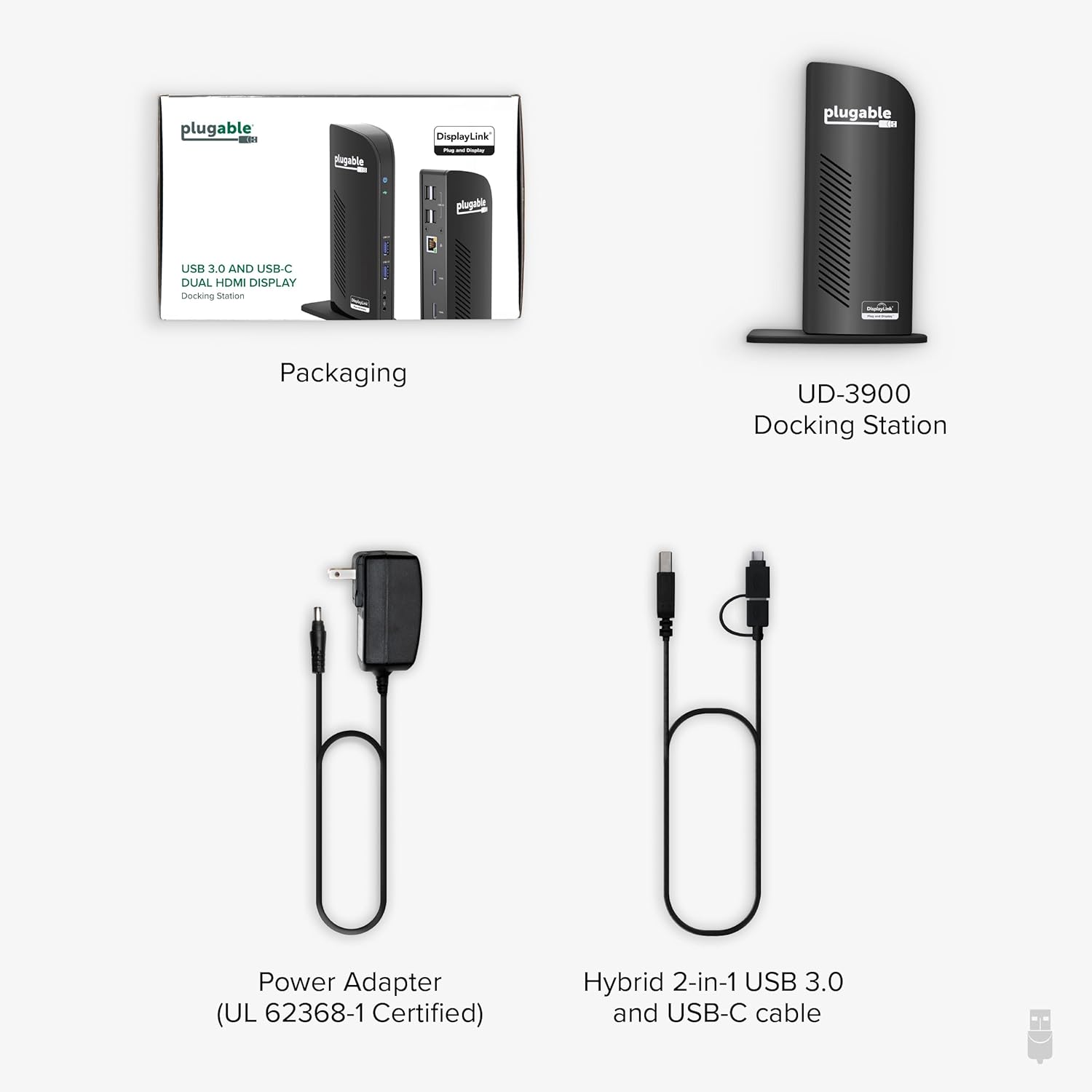 Plugable USB 3.0 Universal Laptop Docking Station Dual Monitor for Windows and Mac, USB 3.0 or USB-C, (Dual Video: HDMI and HDMI/DVI/VGA, Gigabit Ethernet, Audio, 6 USB Ports)