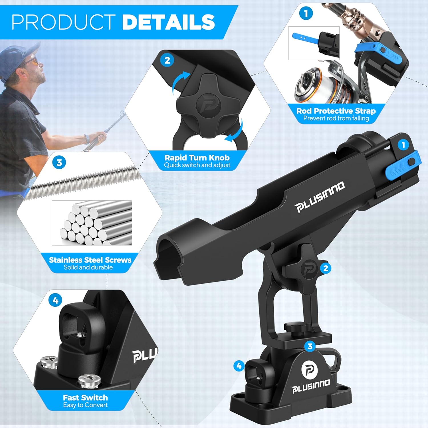 2 in 1 Fishing Pole Holders for Boats: PLUSINNO fishing rod holder boasts cutting-edge design, offering compatibility with both track-mounted and deck-mounted kayak or boat. The kayak fishing rod holder fits most boats, making it ultimate solution for boat fishing enthusiasts. Eliminate need for separate rail/deck boat holders, this rod holder for kayak fishing gear is enough. Solve compatibility dilemmas instantly. Simply install this easy-to-use rod holder in minutes. (Track not included).