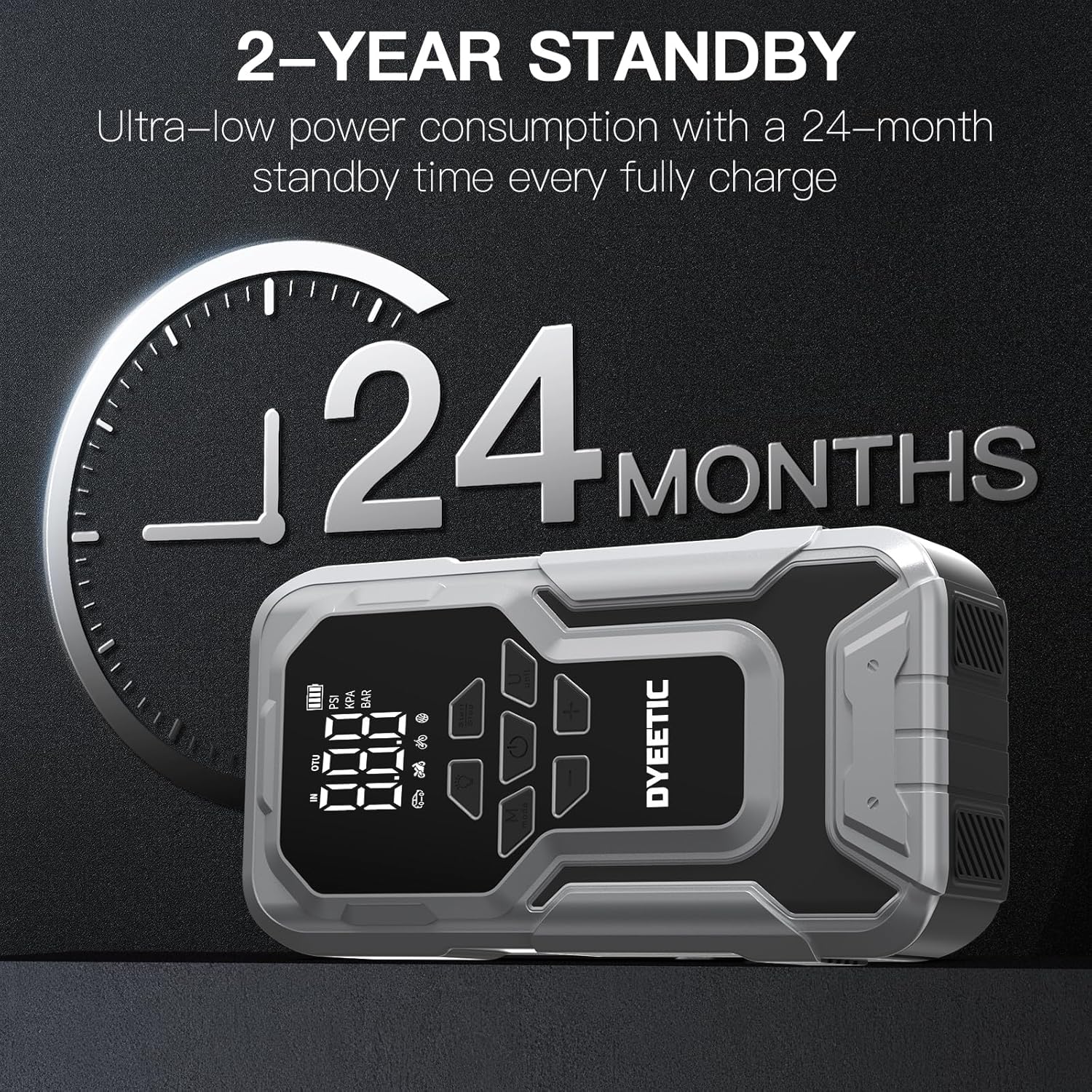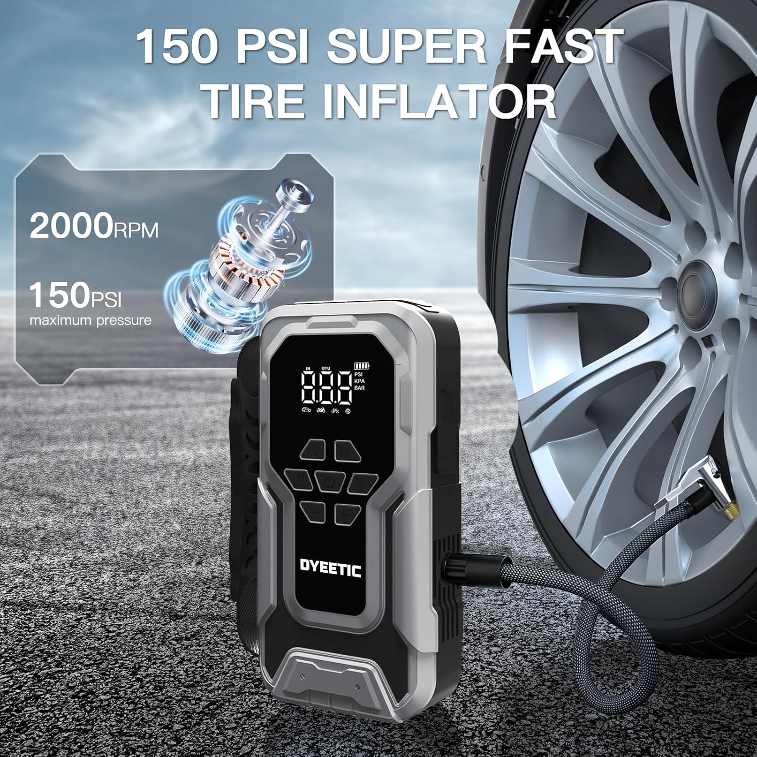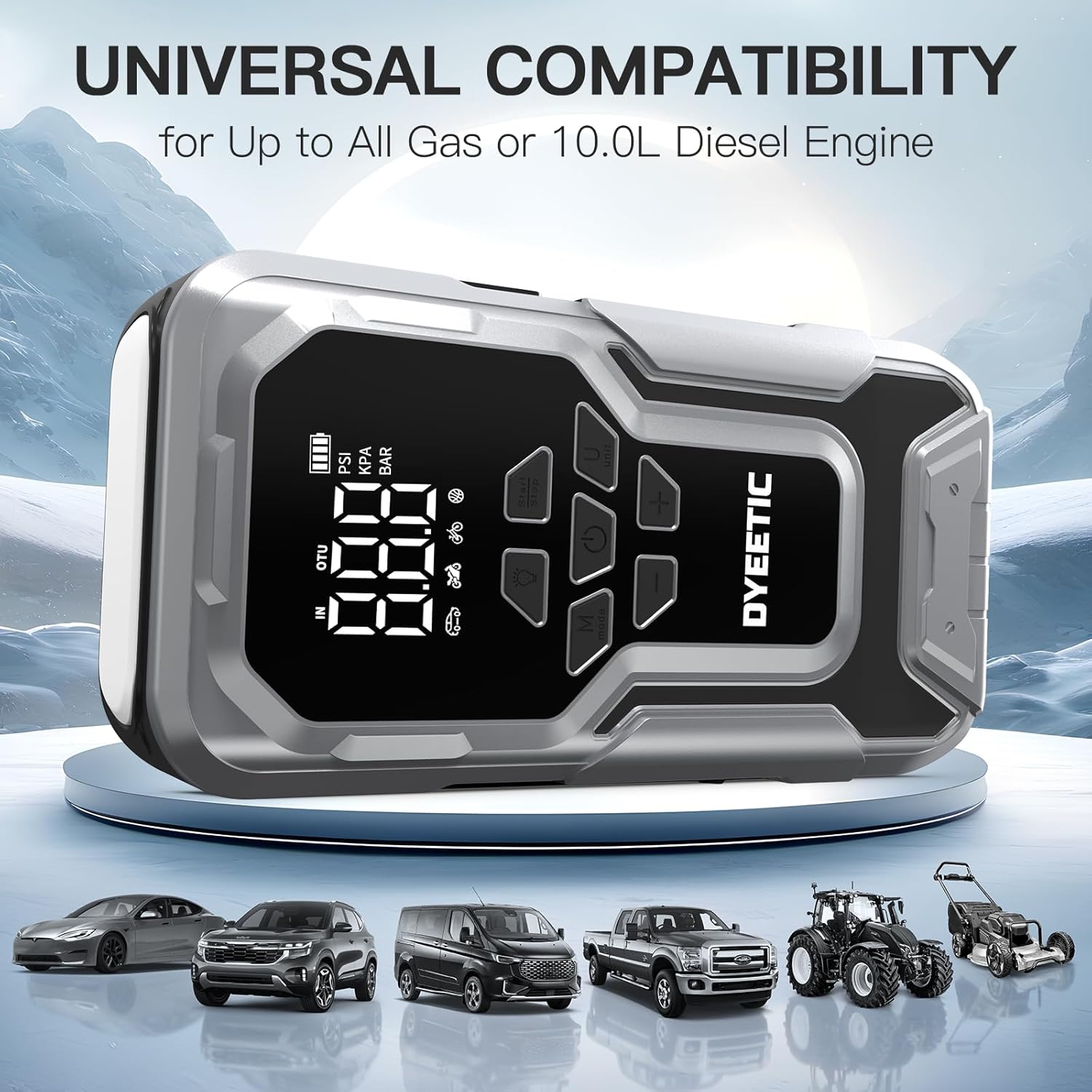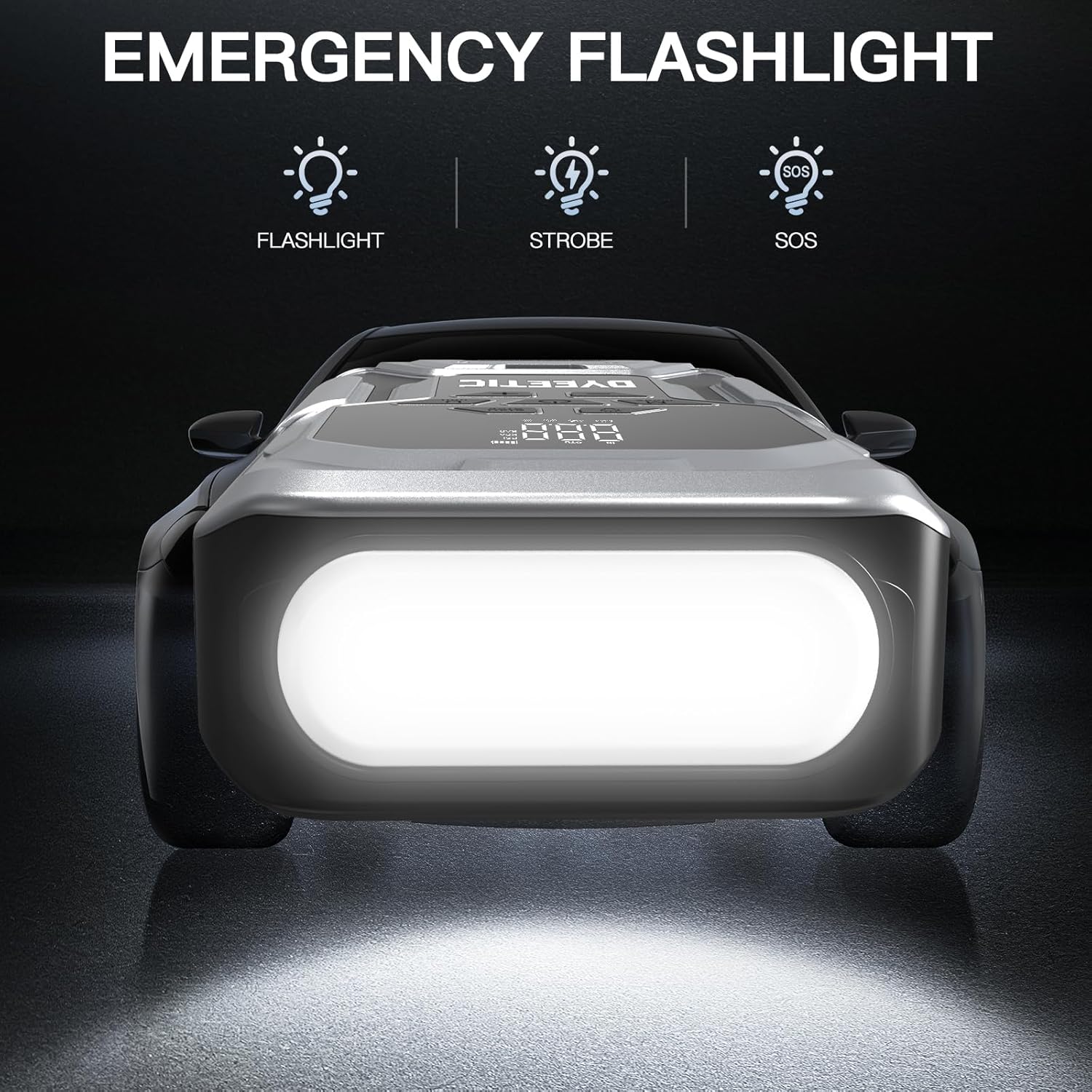 Be prepared for any roadside emergency with the Dyeetic Portable Car Jump Starter with Air Compressor—a powerful all-in-one vehicle safety solution designed to jump-start, inflate, illuminate, and recharge wherever the road takes you.