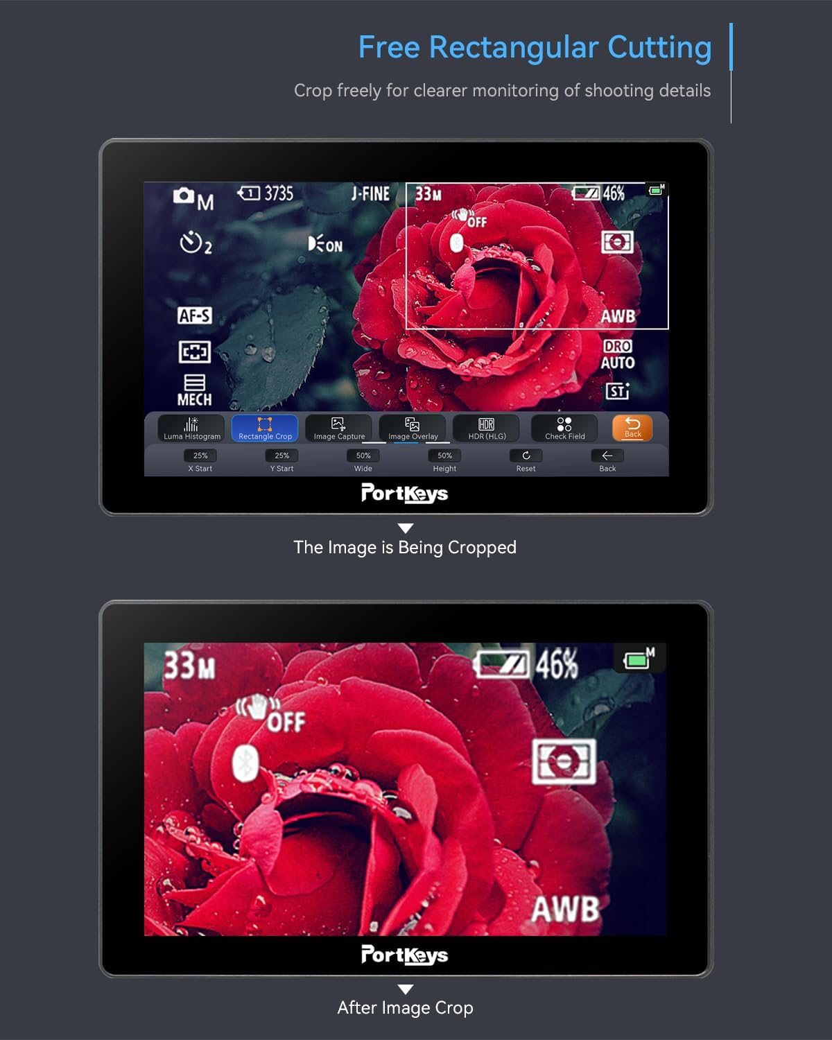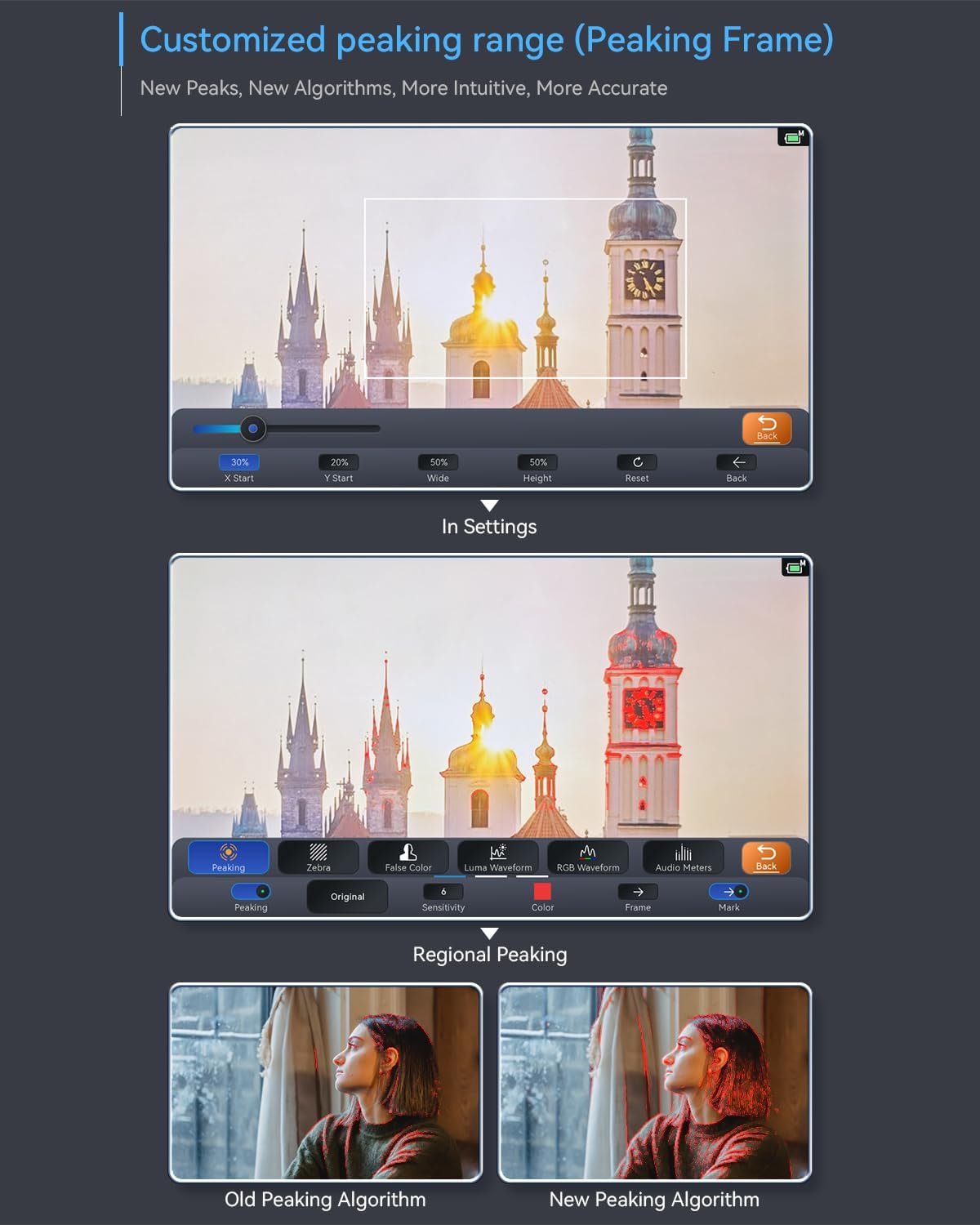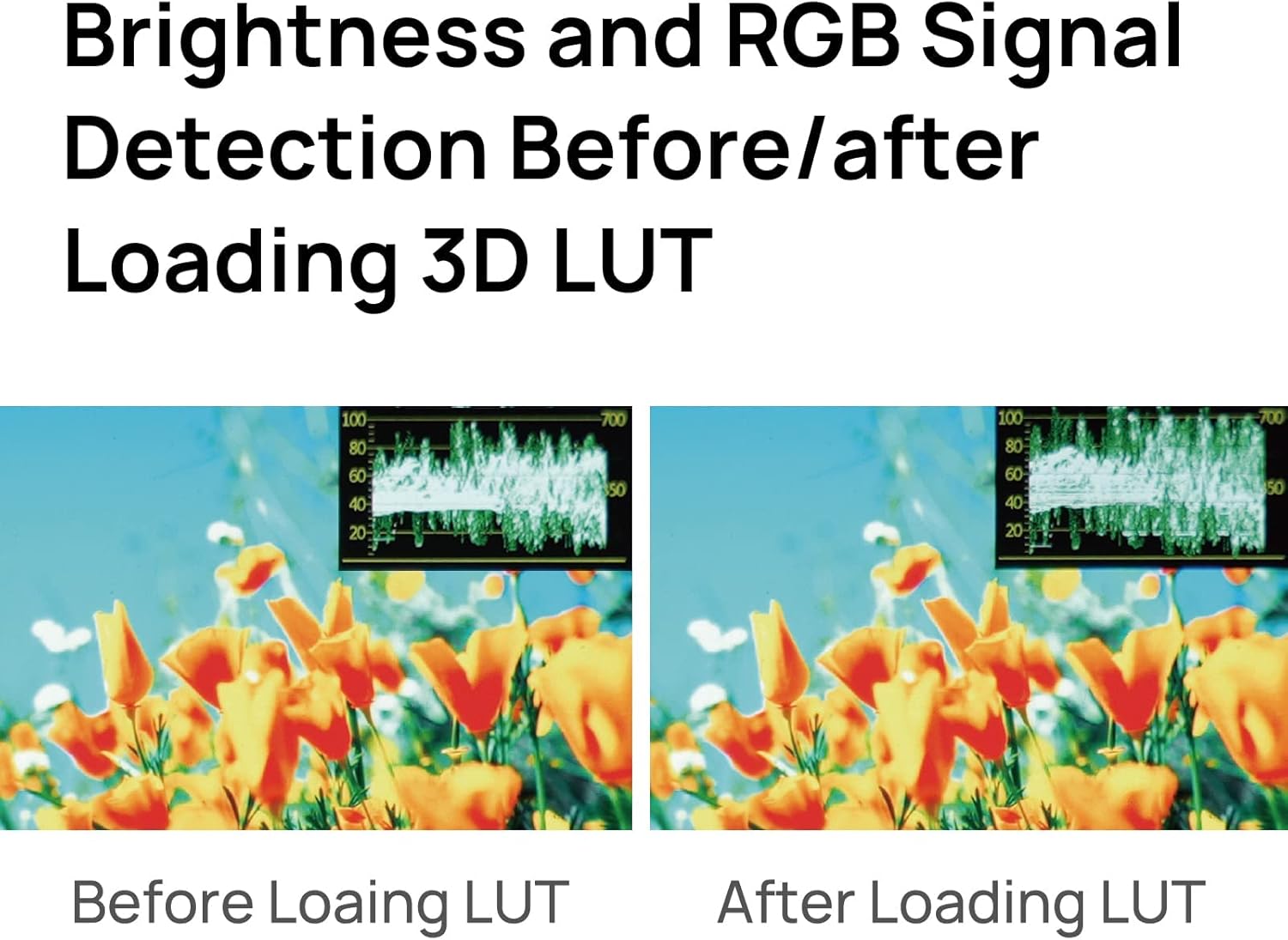 • 【Advanced Features】Anamorphic, 3D LUT, Zebra,Waveform, Check Field, Grids, Audio Meters, Image Flip, Color Temperature, Peaking, Zooming, Cross Hair, Camera Control, Display Flip, False Color, X-Rite Color Calibration System
