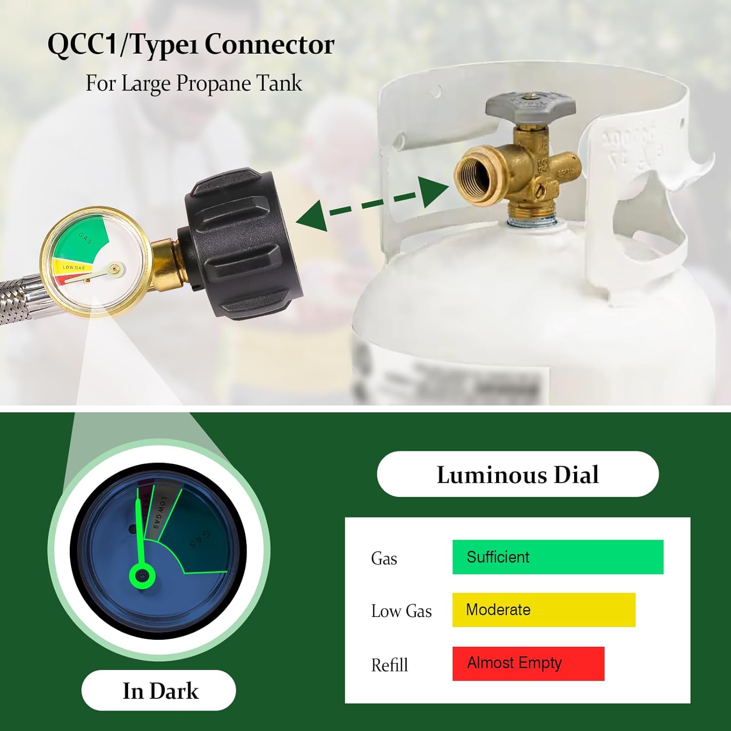 【Propane Gauge & ON/OFF Valve】The night-vision propane tank gauge, integrated into the QCC1 connector, allows you to monitor gas levels in the large propane tank even in low light conditions. With the ON/OFF valve, you have the power to halt the filling process at any moment, prioritizing safety above all else