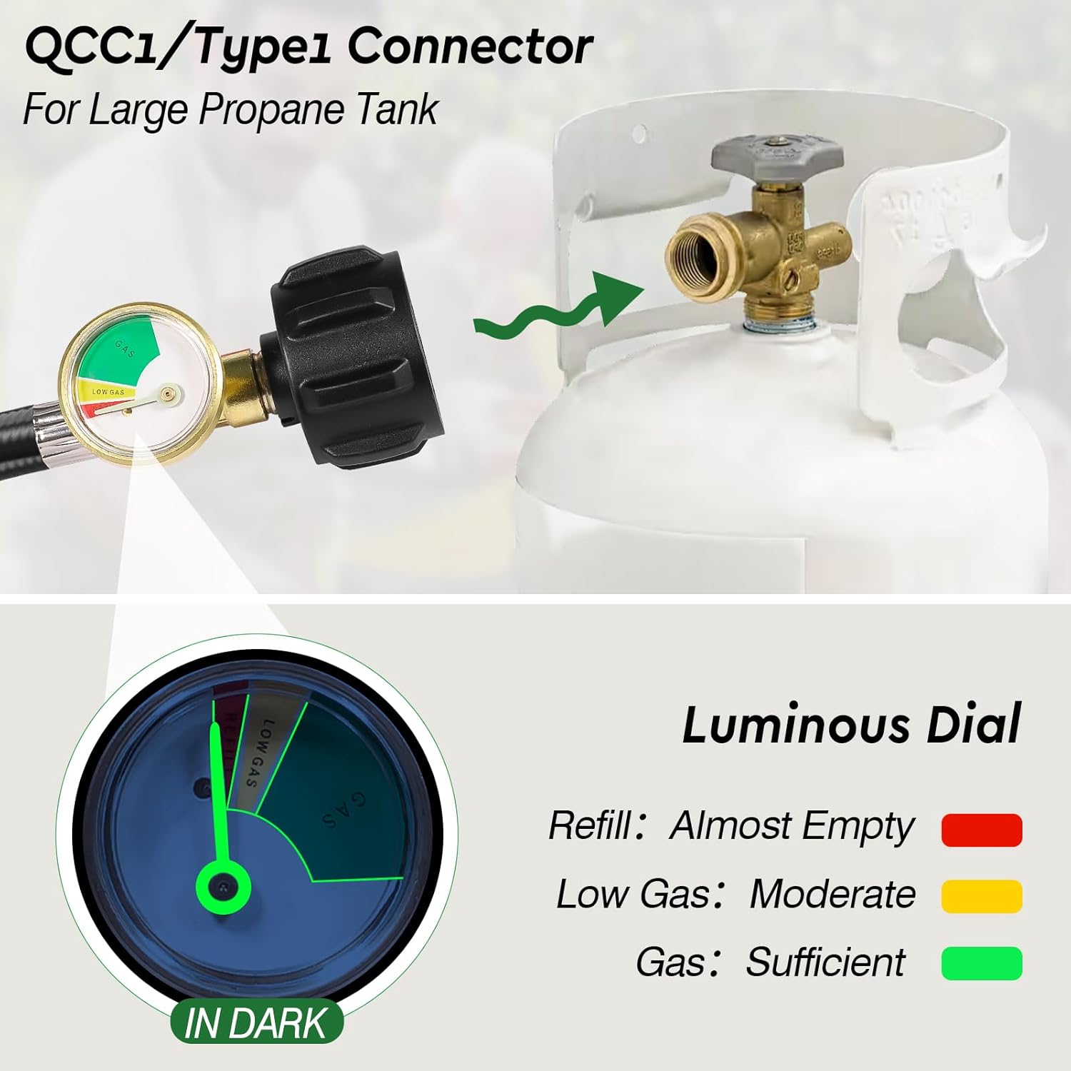 Propane Gauge & ON/OFF Valve: The night-vision propane tank gauge, integrated into the QCC1 connector, allows you to monitor gas pressure in the large propane tank through three color dial. With the ON/OFF valve, you have the power to halt the filling process at any moment