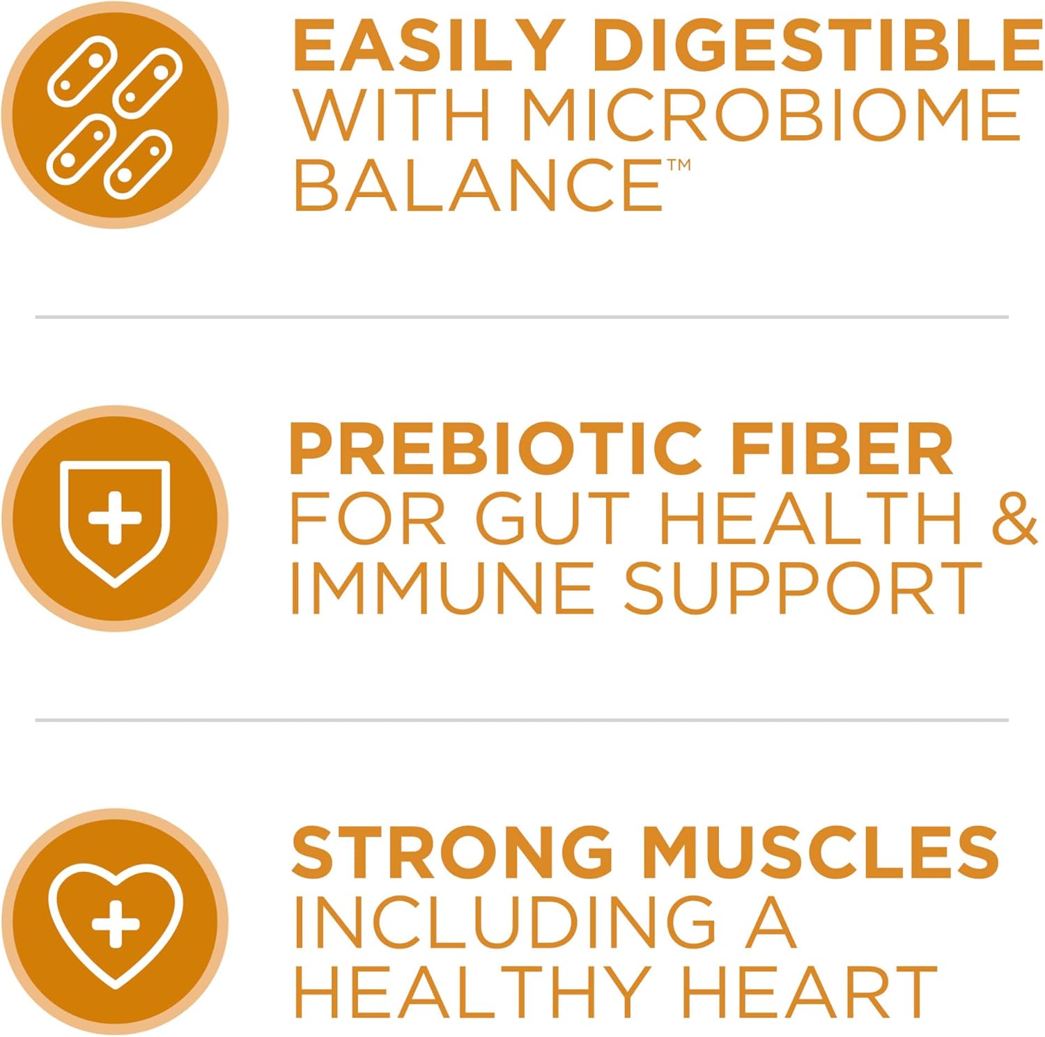Purina ONE chicken and rice dog food is easily digestible with a microbiome balance and a SmartBlend of high-quality ingredients, including prebiotic fiber for dogs