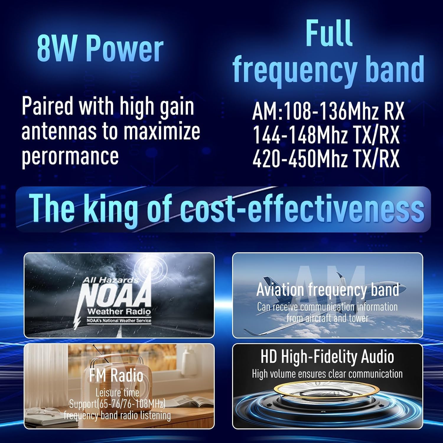 - [Broad Frequency Coverage:] The Radio offers extensive frequency coverage, supporting 8 receiving bands (including FM/AM) and 2 transmitting bands.