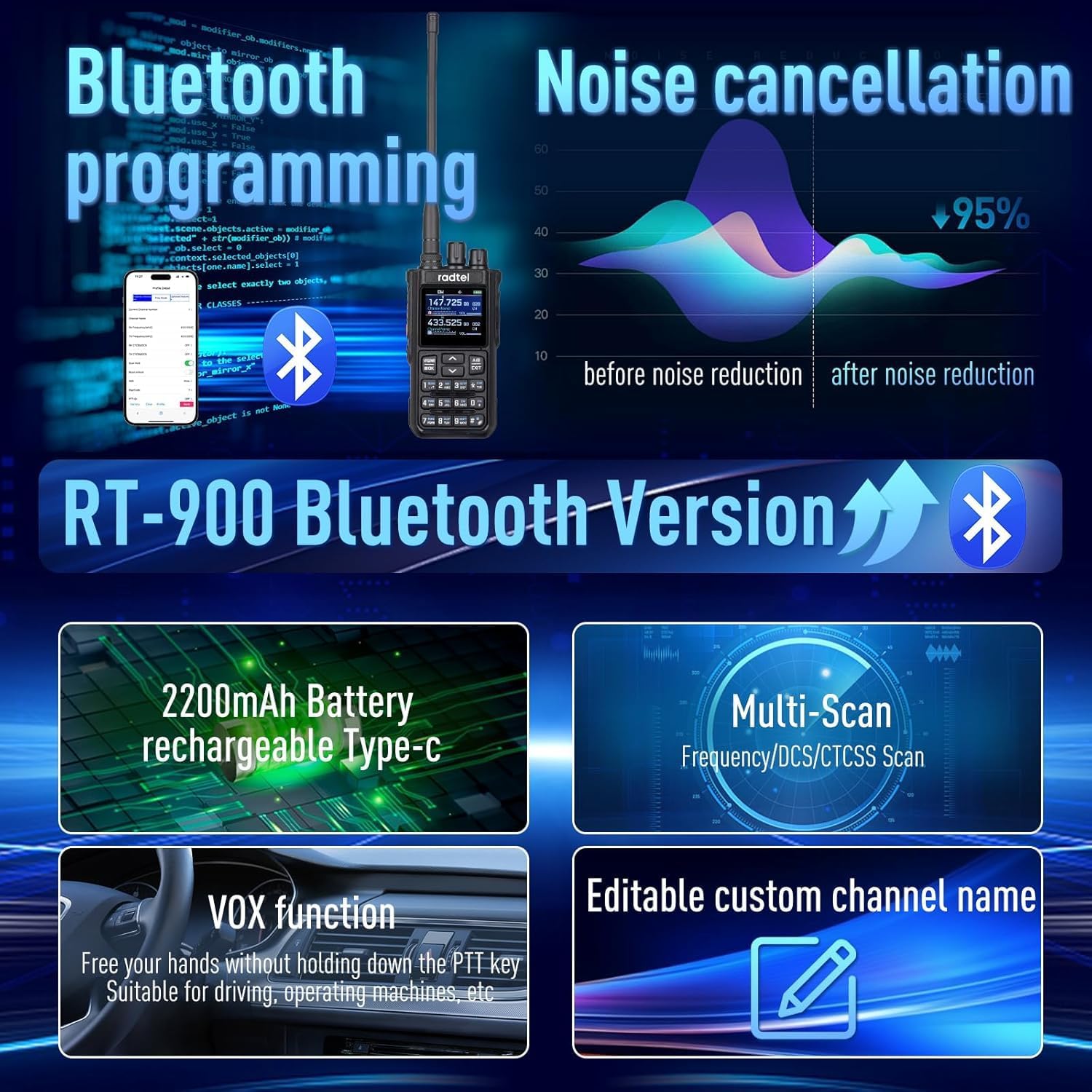 Radtel RT-900 Ham Radio Walkie Talkies 256CH Aviation Air Band Two Way Radio NOAA Police Scanner Marine Long Range Handheld Transceiver USB-C, Wireless Copy Frequency