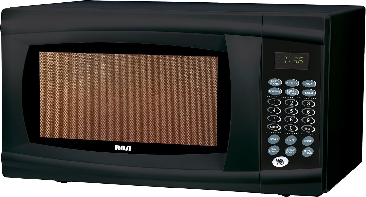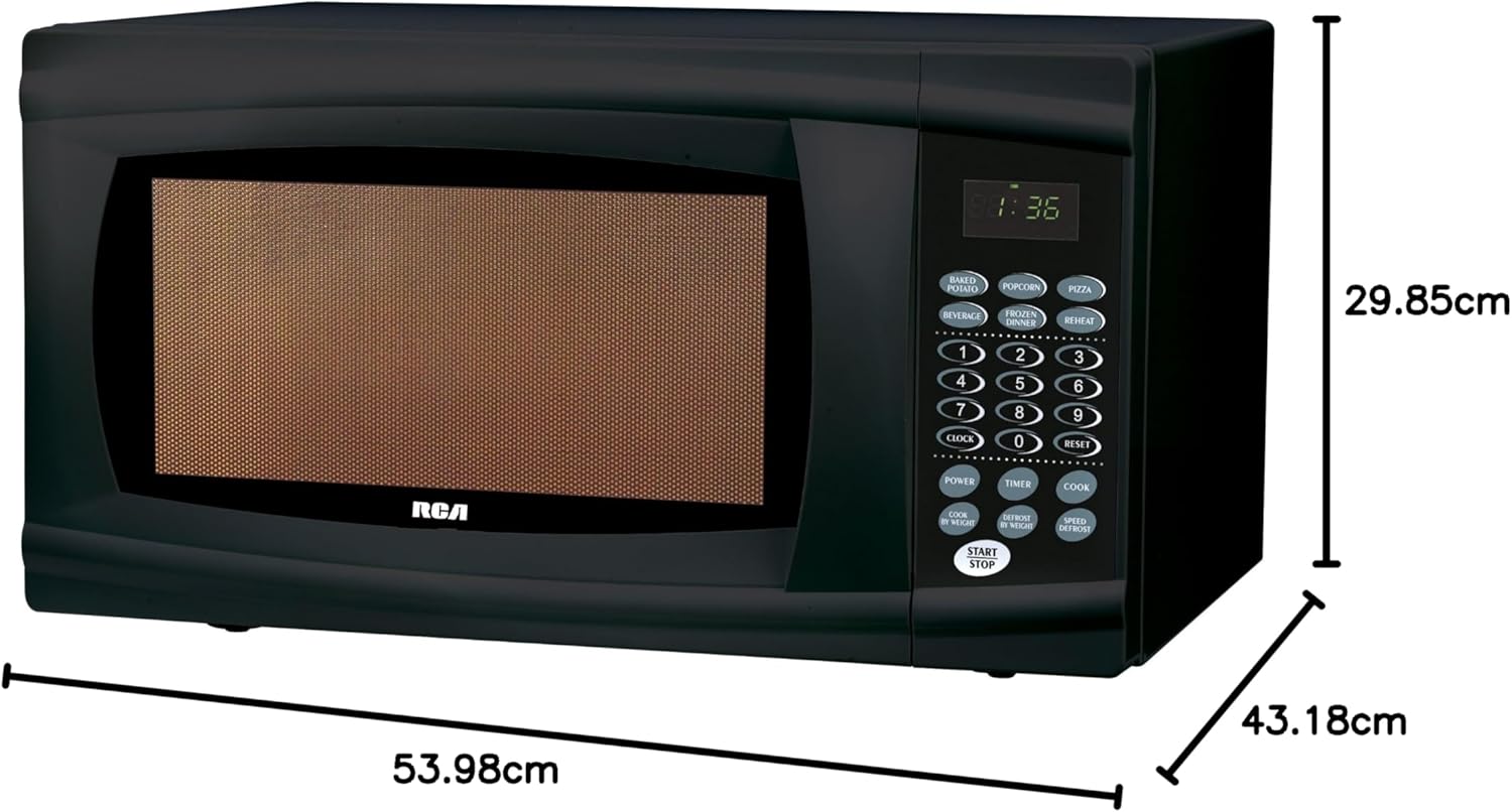 With a 1.1-cubic-foot Capacity, this RCA microwave oven allows for quick and convenient meal preparation. The unit's one-touch auto-cook menu takes the guesswork out of cooking popularly microwaved foods including popcorn, baked potatoes, pizza, beverages, and frozen dinners, while its reheat button makes it easy to warm food items back up again. The microwave's soft-touch electronic control panel also comes with cook-by-weight and defrost-by-weight options, speed defrost that alternates between defrost and stand times for efficient results, a start/stop button, and a reset button to clear all previous settings. Choose from 10 power levels for added versatility and control. Other highlights include a removable glass turntable, a handy digital clock and kitchen timer, child safety-lock protection, and an end-of-cycle audio signal, which helps prevent mugs of reheated tea or coffee from being forgotten about. The glass turntable cleans up easily by hand or in the dishwasher, and the interior and exterior of the appliance can be wiped down with a damp cloth as needed. This microwave is the perfect size for all your cooking needs.