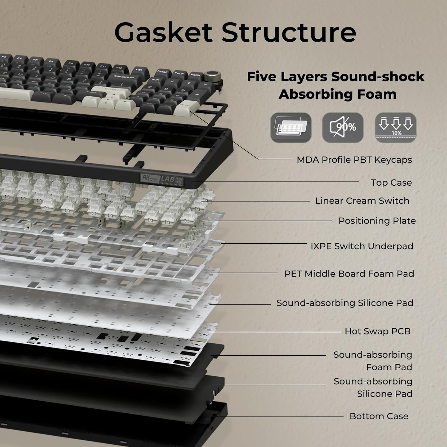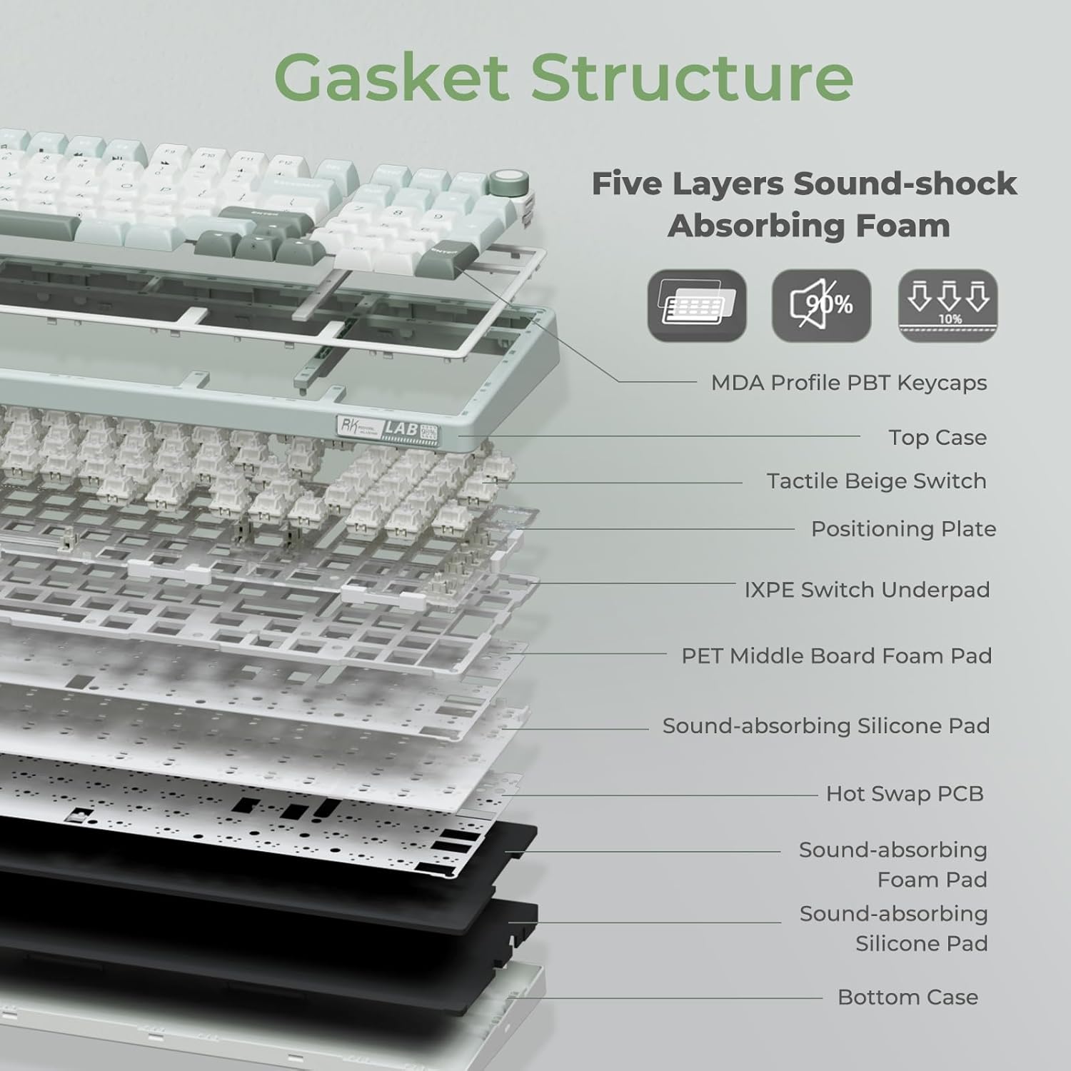 - đăHot Swappable & Pre-lubed Beige Switchesă: Hot swappable mechanical keyboard supports 3/5-pin switches. Pre-lubed beige switch is a custom tactile switch with fast response and clear keystroke feedback, suitable for typists and enthusiasts seeking unique typying experience