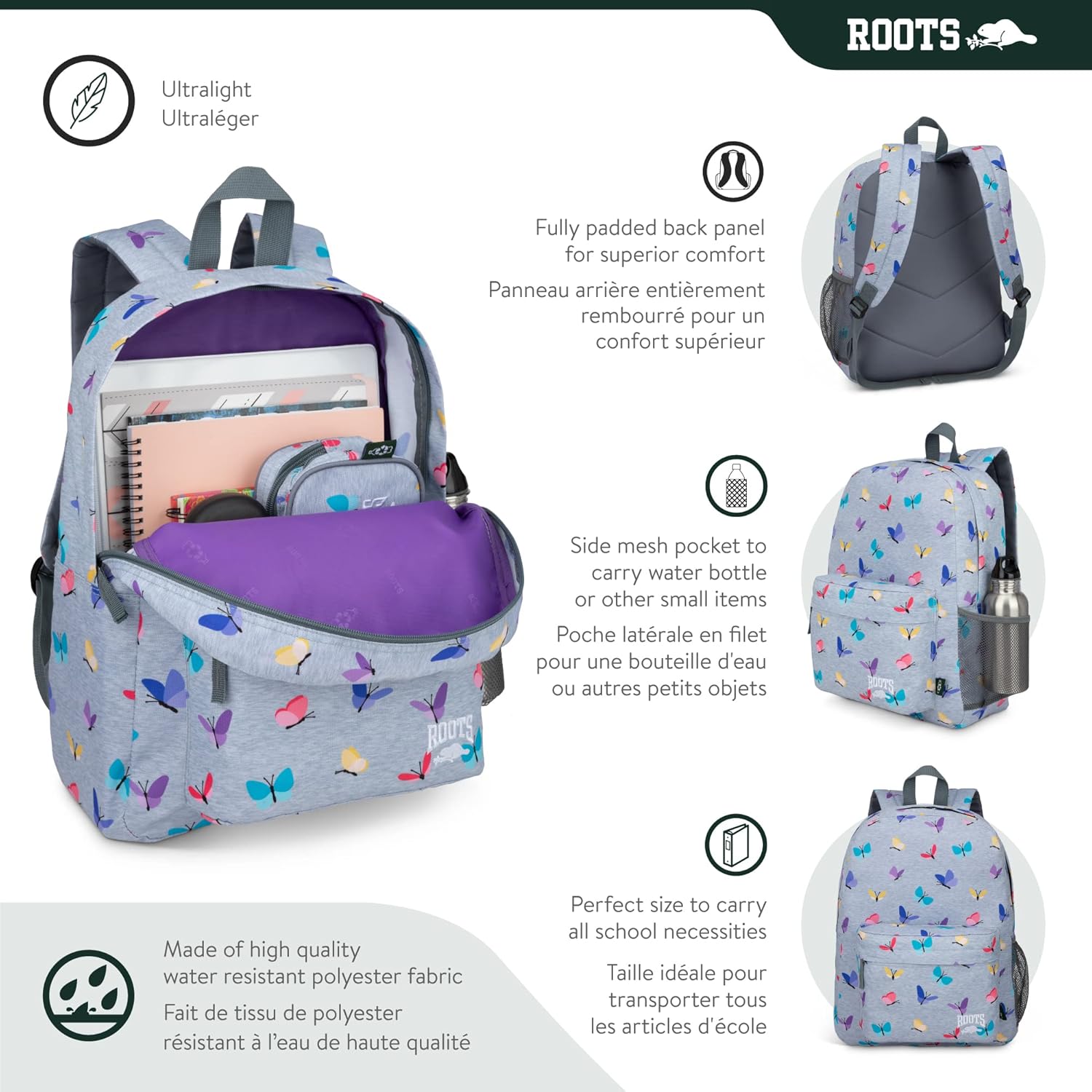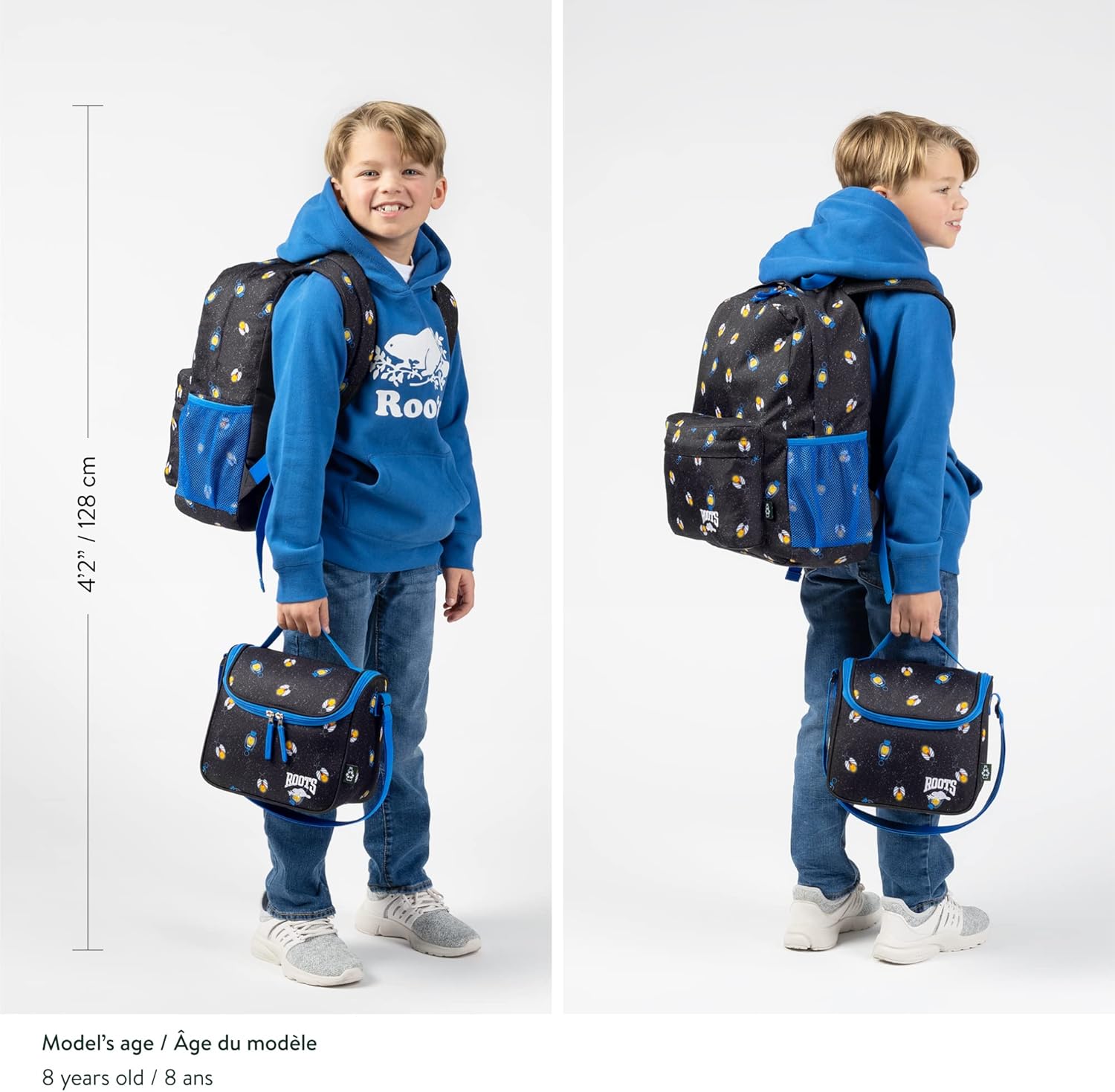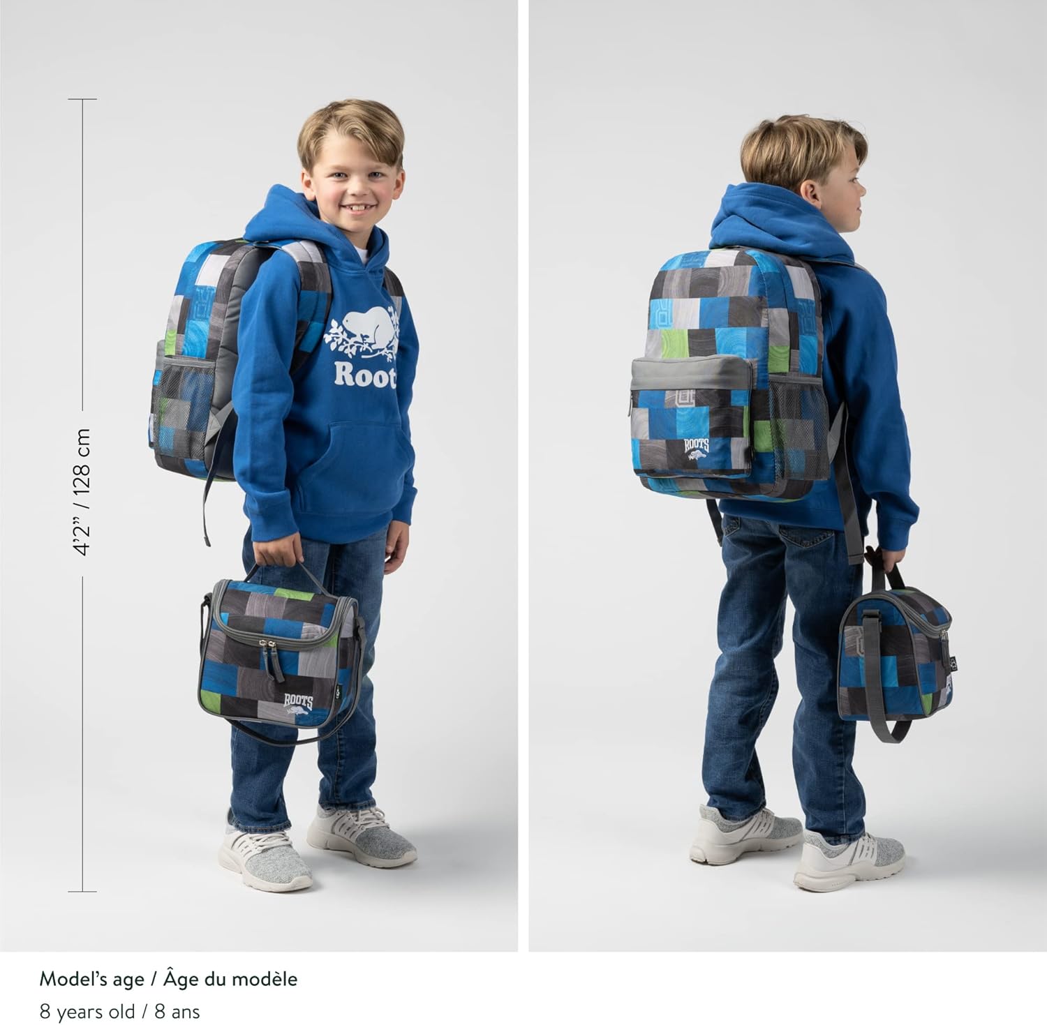 Roots Essential 3-in-1 Backpack and Lunch Bag Set with Bonus Pencil Case: The ultimate back-to-school solution for kids. With spacious and organized storage, there is everything needed to take on a new school year with stylish ease. The backpack has a large main compartment perfect for fitting all the school necessities from binders, books, headphones, and accessories. The fully padded back panel and ergonomically contoured and breathable shoulder straps with an accessory pocket provide superior comfort, designed to be gentle on growing bodies. The BPA-free lunch bag's high-performance insulation keeps food hot and fresh for more than 8 hours while the easy-to-clean lining helps with accidental spills. Choose from a range of fun and stylish colors and prints to give your child's school set a personalized touch. Tested above the industry standards for strength and durability, this set is made with high-quality water-resistant polyester fabric, rust-resistant zippers and easy-to-grab pullers—a school set designed to last and comes with a 2-year limited warranty. The main body fabric and lining are also made from 100% post-consumer recycled plastic bottles or textiles which helps to stop plastic bottles from ending up in landfills. The Roots Essential 3-in-1 Matching Kids Backpack with Lunch Bag and bonus Pencil Case is the perfect way to get your kid ready for the school year. Having everything you need to have a good day: that is priceless.