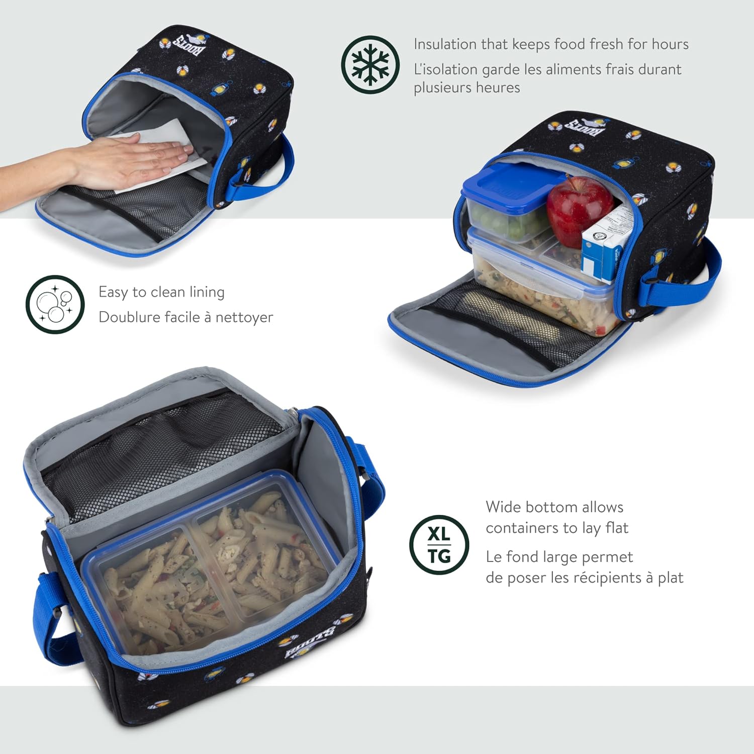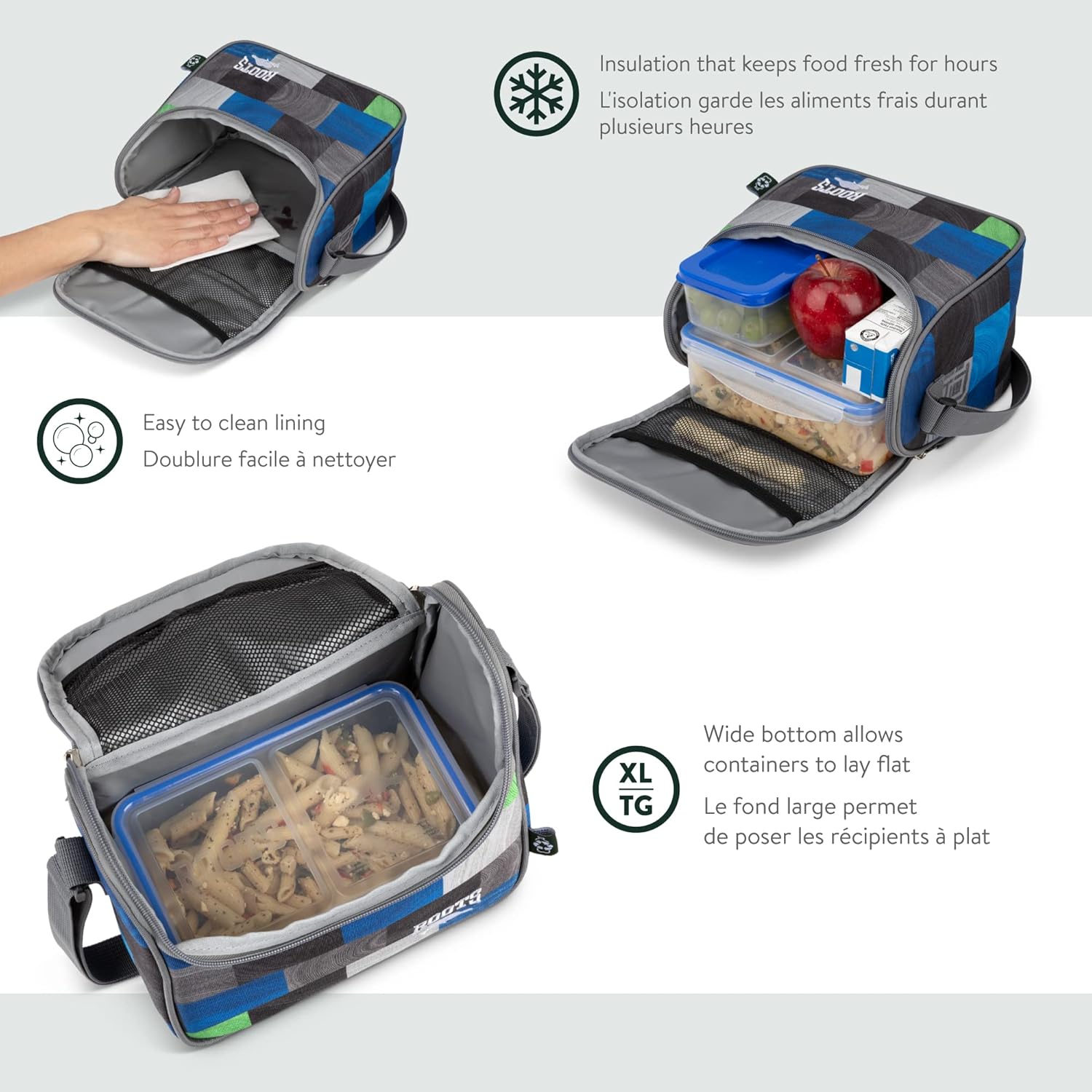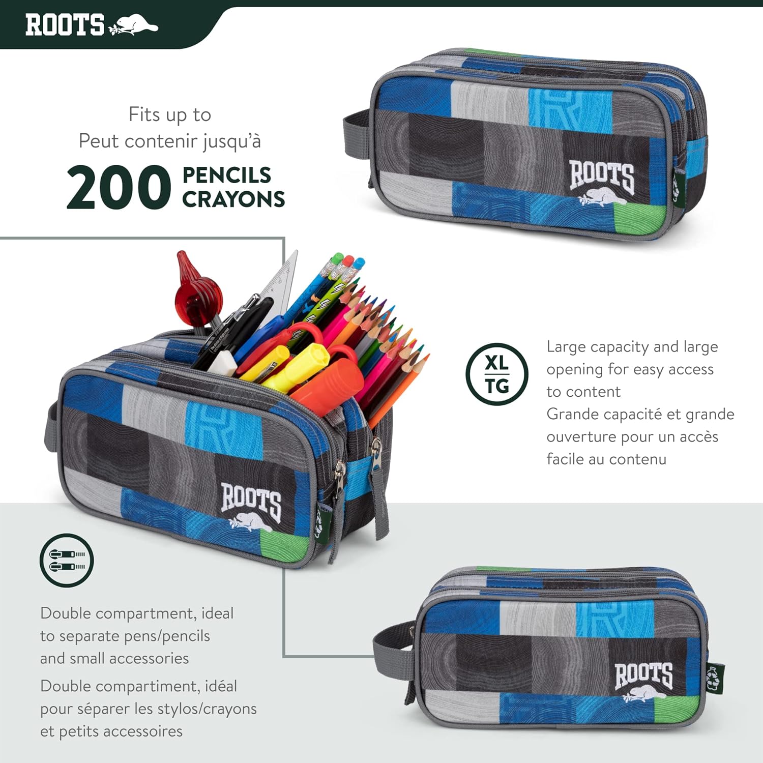 Roots Essential 3-in-1 Backpack and Lunch Bag Set with Bonus Pencil Case: The ultimate back-to-school solution for kids. With spacious and organized storage, there is everything needed to take on a new school year with stylish ease. The backpack has a large main compartment perfect for fitting all the school necessities from binders, books, headphones, and accessories. The fully padded back panel and ergonomically contoured and breathable shoulder straps with an accessory pocket provide superior comfort, designed to be gentle on growing bodies. The BPA-free lunch bag's high-performance insulation keeps food hot and fresh for more than 8 hours while the easy-to-clean lining helps with accidental spills. Choose from a range of fun and stylish colors and prints to give your child's school set a personalized touch. Tested above the industry standards for strength and durability, this set is made with high-quality water-resistant polyester fabric, rust-resistant zippers and easy-to-grab pullers—a school set designed to last and comes with a 2-year limited warranty. The main body fabric and lining are also made from 100% post-consumer recycled plastic bottles or textiles which helps to stop plastic bottles from ending up in landfills. The Roots Essential 3-in-1 Matching Kids Backpack with Lunch Bag and bonus Pencil Case is the perfect way to get your kid ready for the school year. Having everything you need to have a good day: that is priceless.