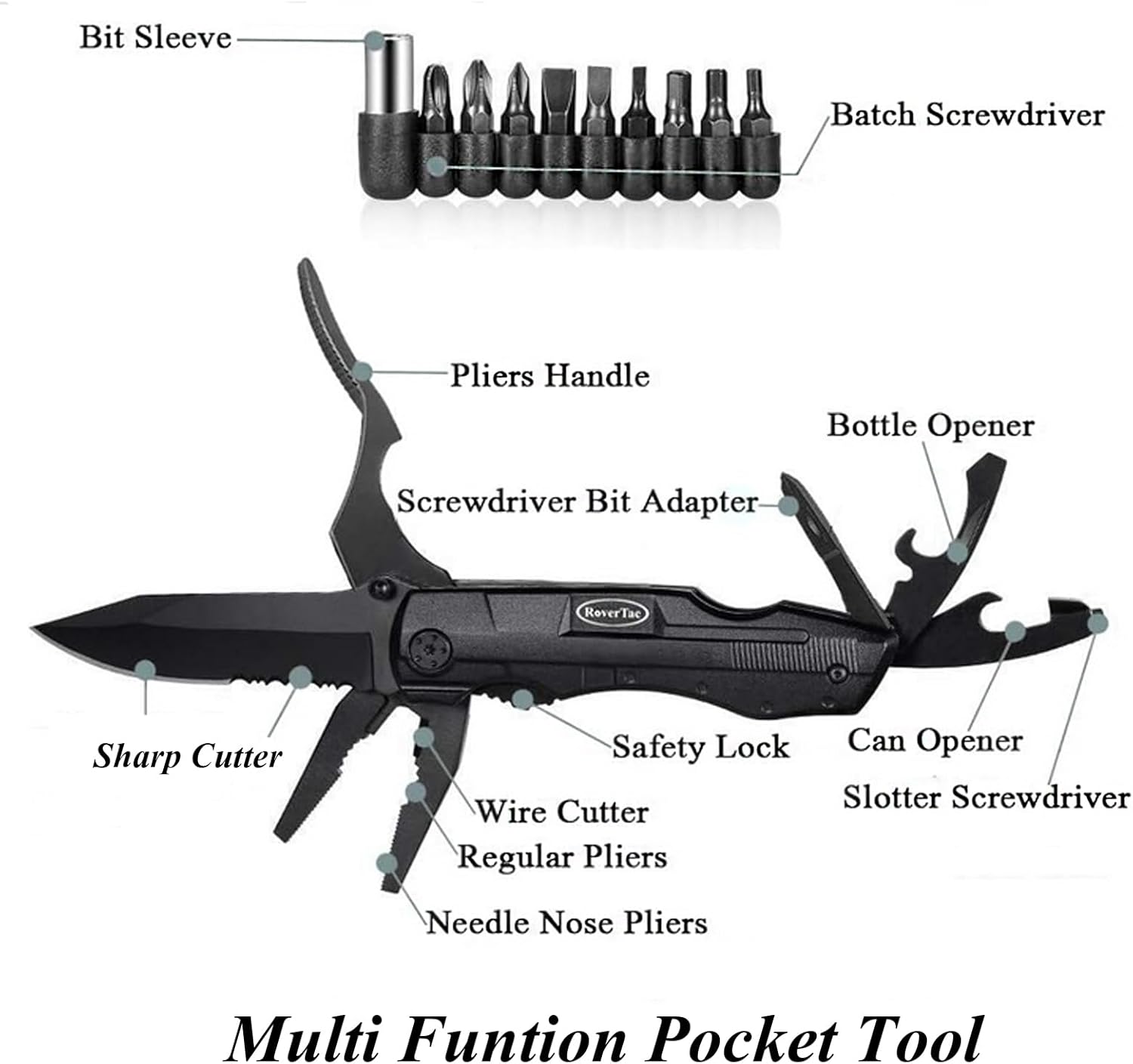 RoverTac Pocket Knife Tactical Folding Knife Multi Tool Survival Camping Knife, Multitool Knife Pliers Bottle & Can Opener 9-Pack Screwdrivers Liner Lock Nylon Sheath, Pocket Knife for Camping Hiking