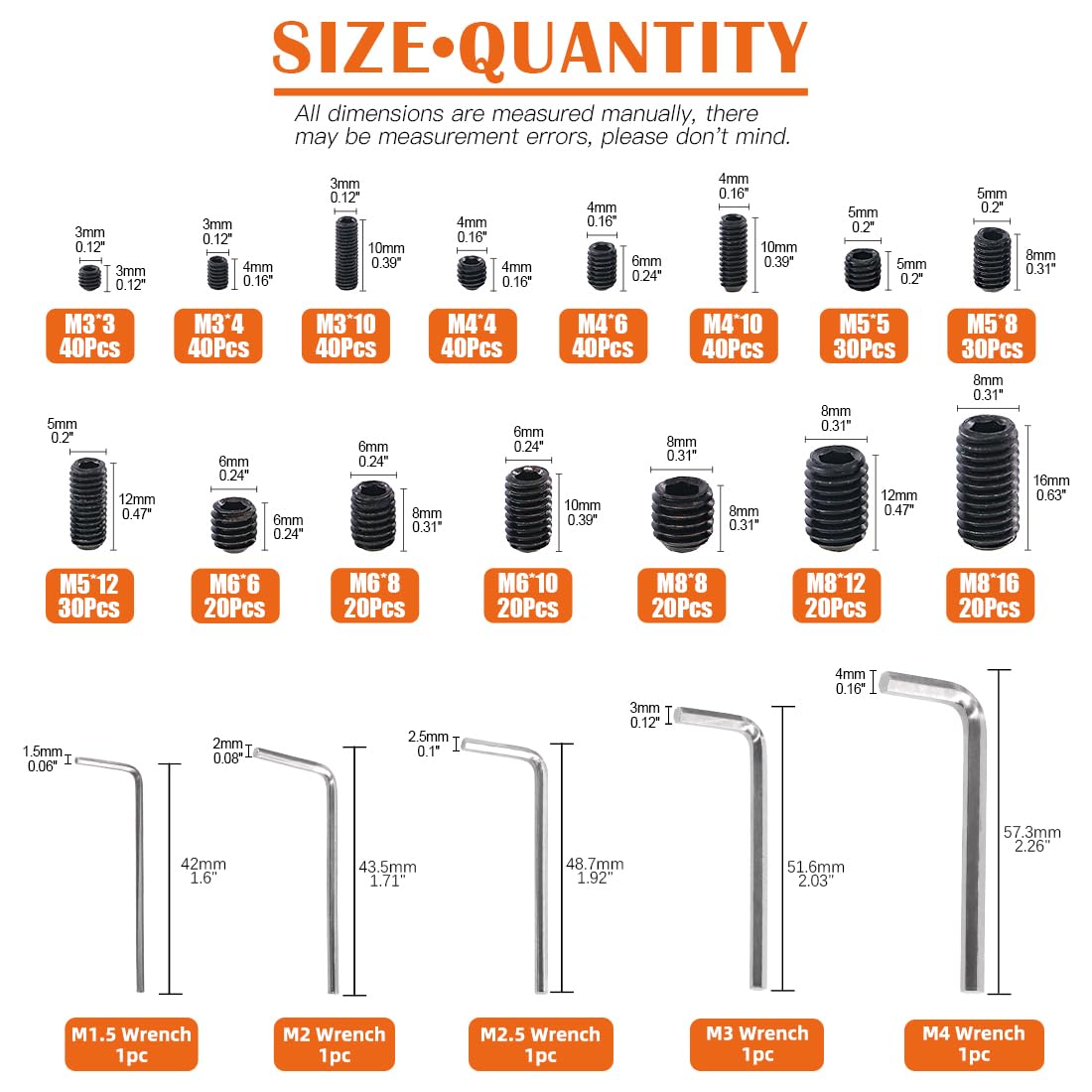 ✔SCREW SIZES --- M3 x 3, M3 x 4, M3 x 10, M4 x 4, M4 x 6, M4 x 10, M5 x 5, M5 x 8, M5 x 12, M6 x 6, M6 x 8, M6 x 10, M8 x 8, M8 x 12, M8 x 16, 15sizes in total, you can choose the suitable to meet your different needs.