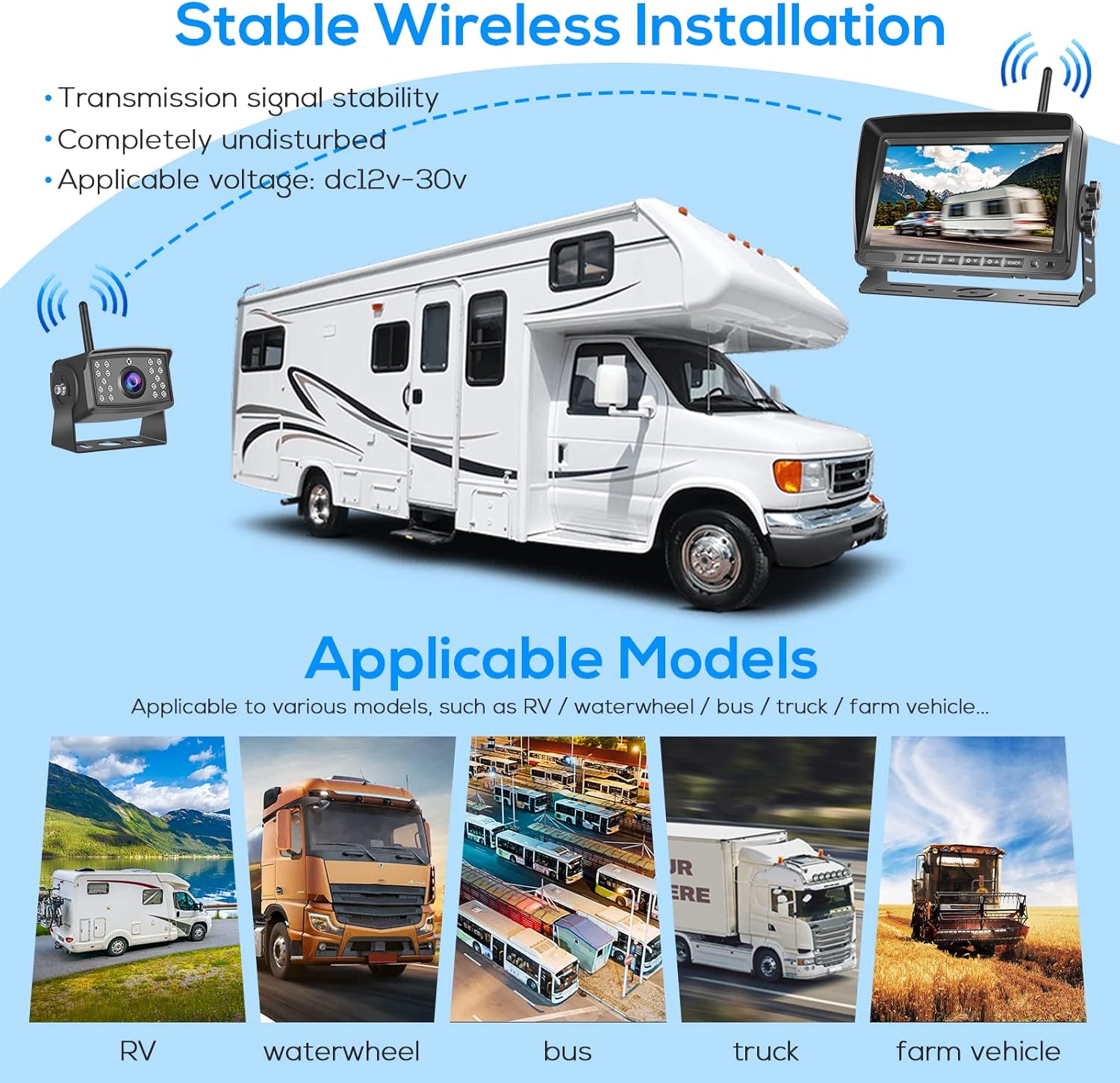 •  Upgraded RV Wireless Backup Camera System: The upgraded wireless backup camera uses the latest chip to transmit video pictures through digital signals. It has strong anti-interference and can truly restore the clear and reliable picture after the car
