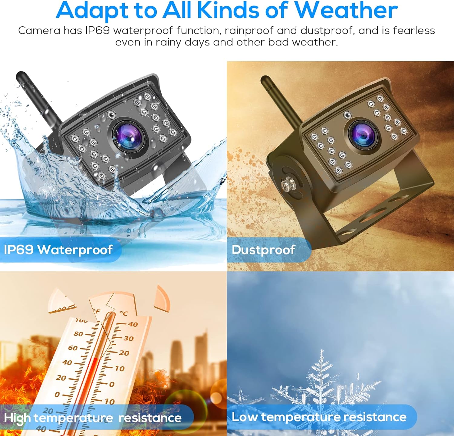 • AHD Waterproof Wireless RV Camera: The reverse camera has IP66 waterproof function, rainproof and dustproof, and is fearless even in rainy days and other bad weather. A wide angle of view of 150-degree can provide more picture information.With 18 Infrared lights,provide crystal clear picture even at night