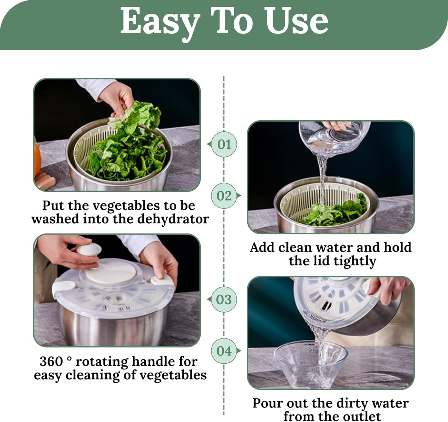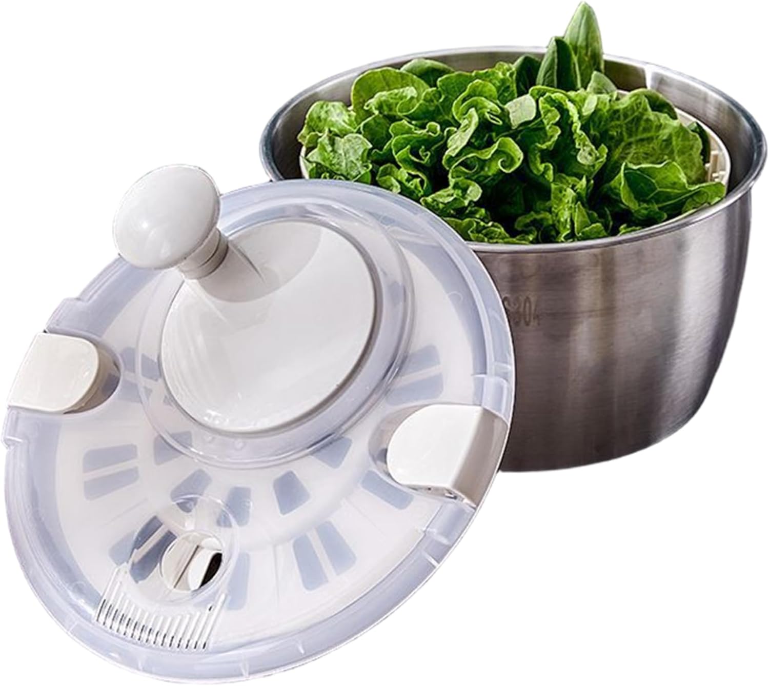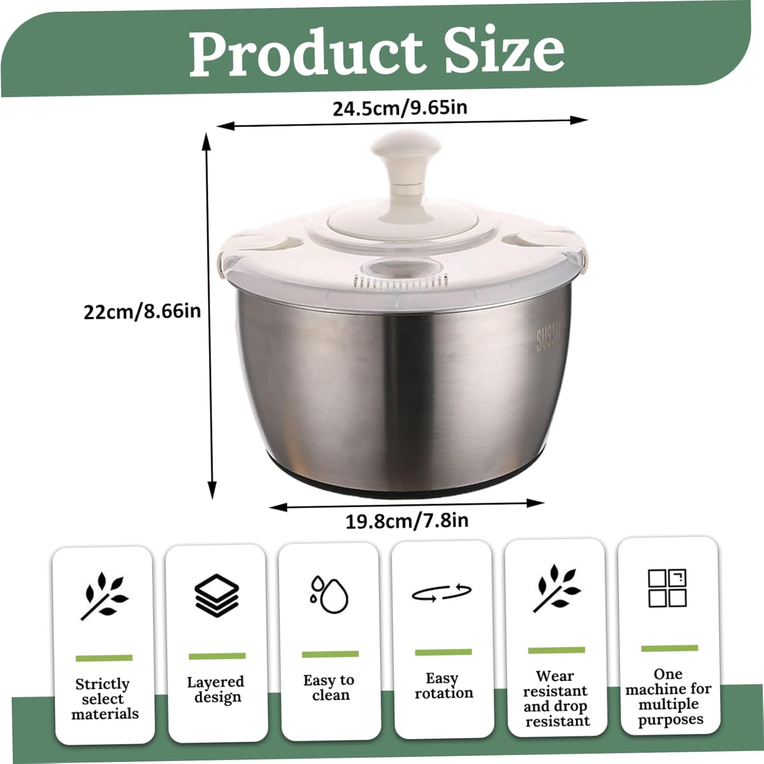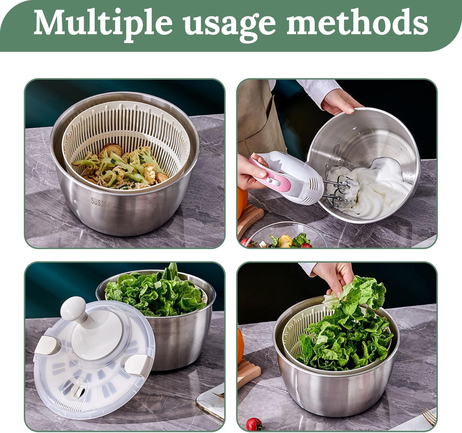 • Sturdy Construction: Made from premium stainless steel and PP materials, this salad spinner is built to last, providing long-lasting strength and resistance to everyday wear and tear in the kitchen.