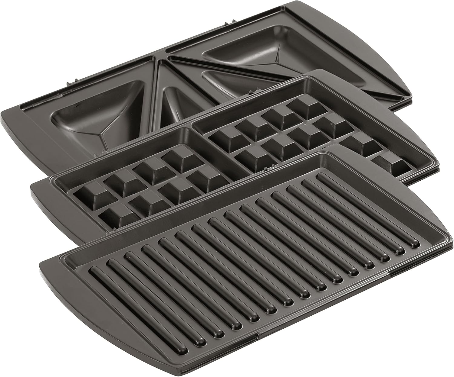 It's a grill, it's a sandwich maker, it's a waffle baker - all in one. This 7 piece set includes sandwich, waffle and grill plates. Top and bottom heating elements cook both sides simultaneously for faster cooking. Dishwasher safe non-stick plates make cleanup a breeze. Comes with Power and Ready lights as well as cool touch handles. Make your own creation or use our included recipe guide to make warm satisfying meals right at home.