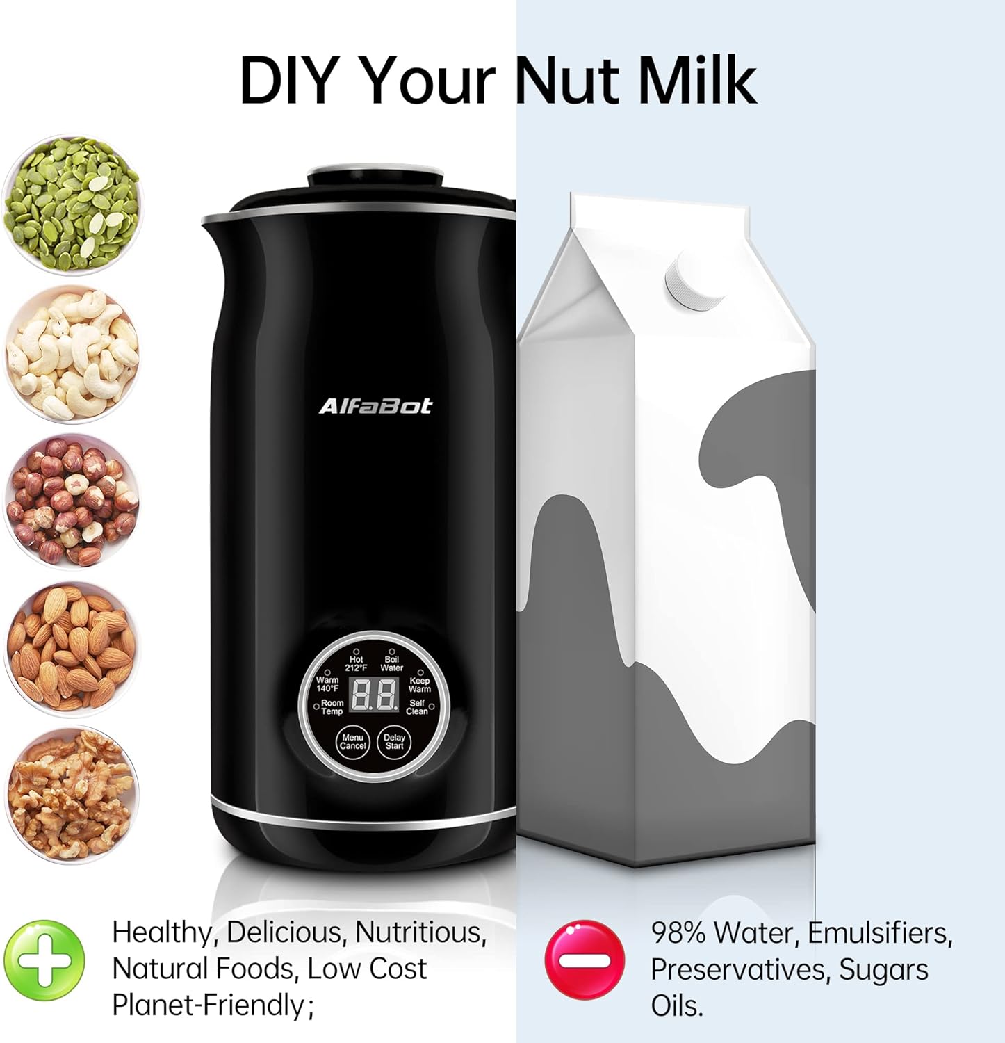 - SIMPLE OPERATION - Using AlfaBot soy milk maker is simple, just add your nuts to the machine with water, and press the button to start the blending and straining process. You can also add sweeteners, flavors, and other ingredients to customize your milk to your liking. Experience the joy of making your own delicious and nutritious nut milk with our N1 nut milk maker.