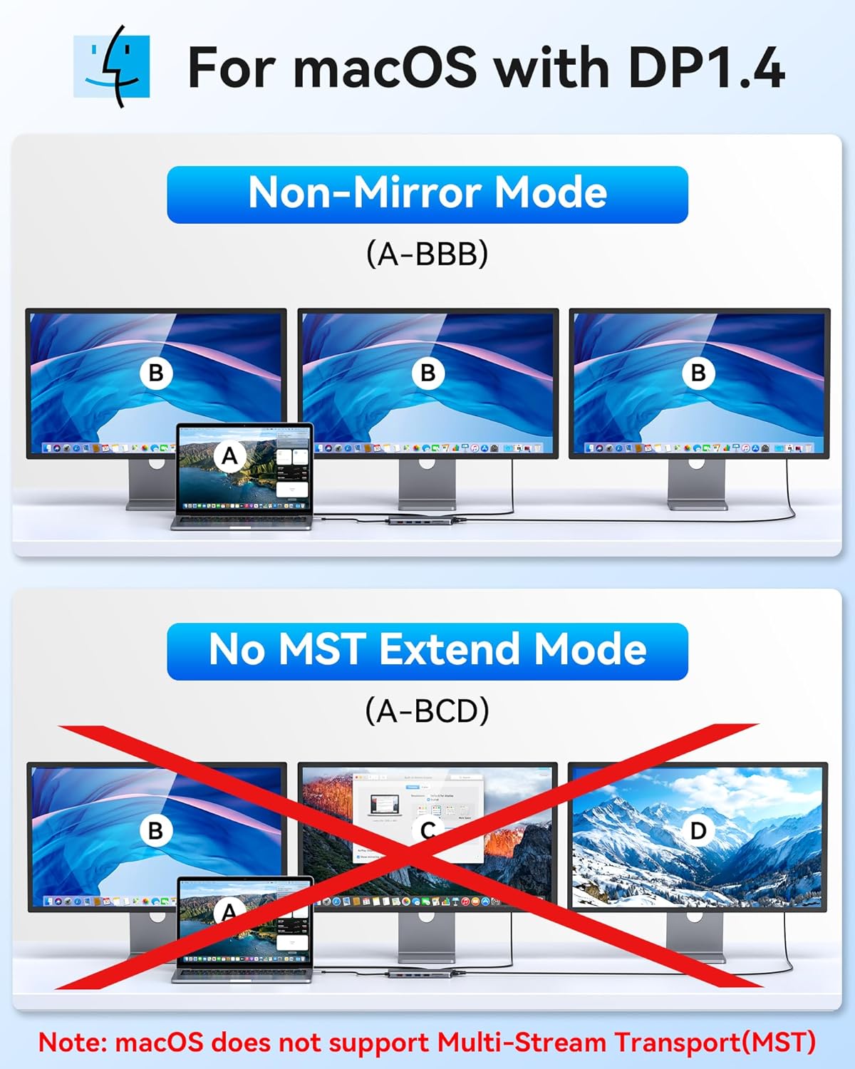 【USB C Hub Docking Station Dual HDMI Monitor Ultra HD 4K output & Triple Display】: Selore usb c docking station for laptop dual monitor extend to dual HDMI + VGA. Windows laptop support mirror mode and extend mode(Display three different screens simultaneously), Mac ONLY support Mirror mode (M1 and M2 Chip supports displaying three identical screens). All of the above mode is based on DP1.4 laptop and monitor